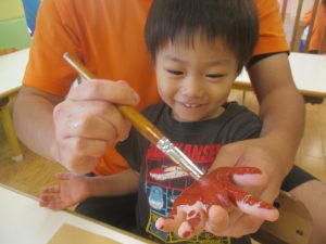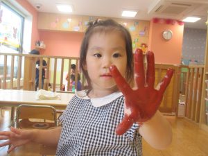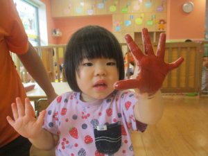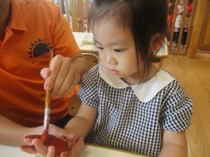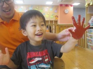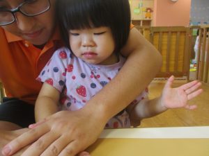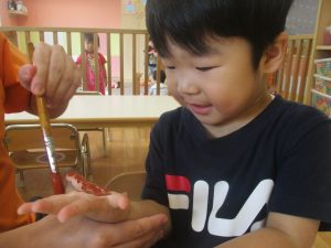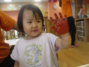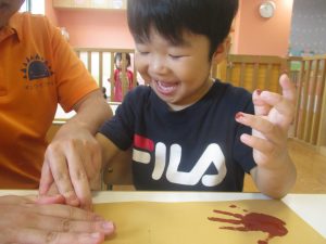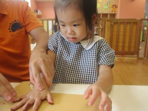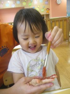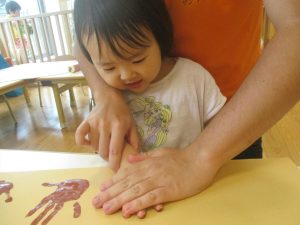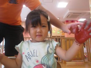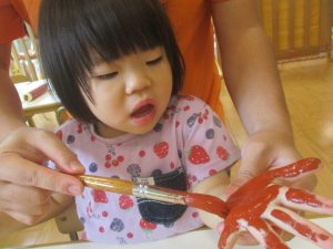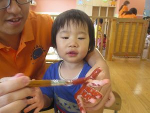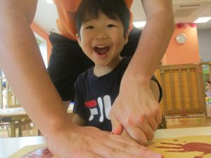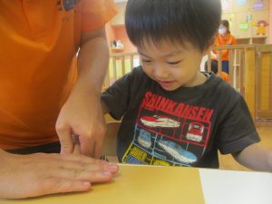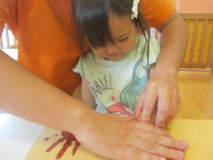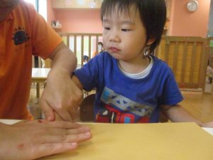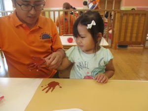 2歳児クラスのお友達は、先生と楽しく秋の製作を行いました♪完成が楽しみです!