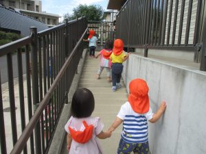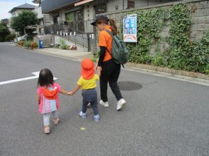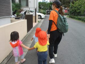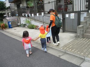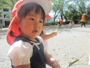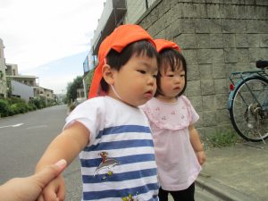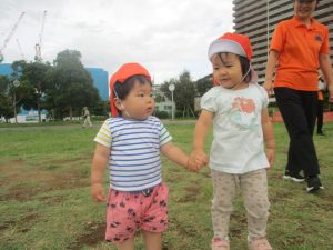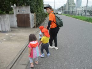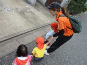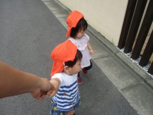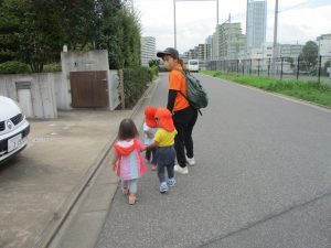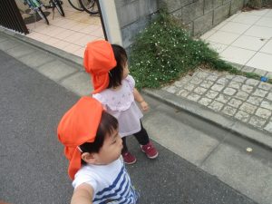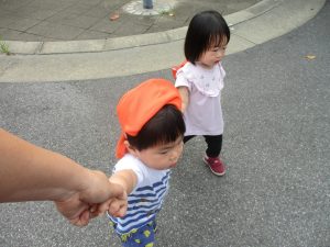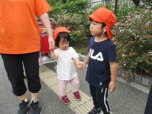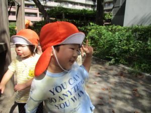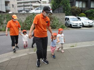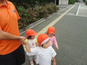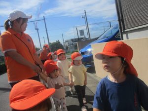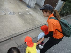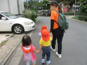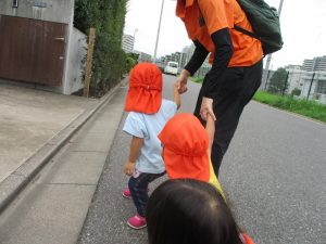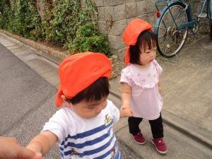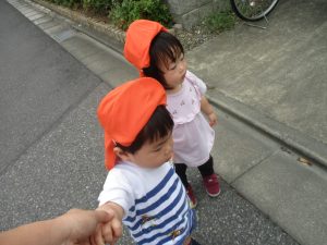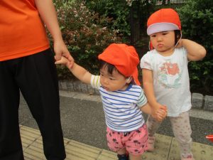 1歳児クラスのお友達は園周辺の戸外散歩でしたが、手を繋いで一生懸命歩いておりとても可愛いです♪