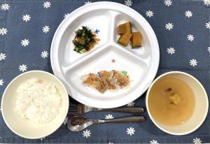 ごはん 味噌汁 魚のごまみそ焼き 小松菜のおかか和え かぼちゃの甘煮