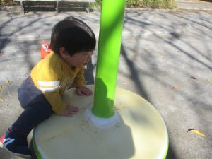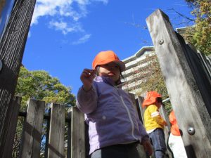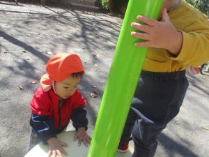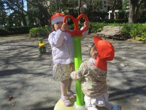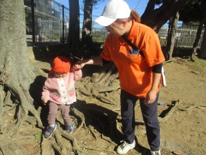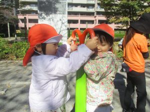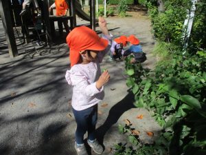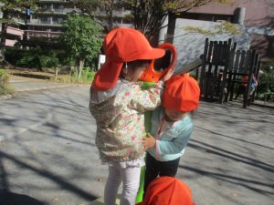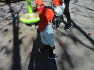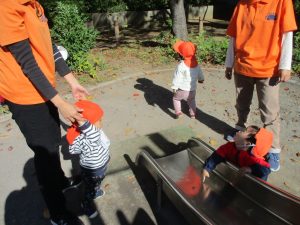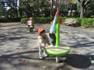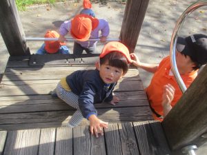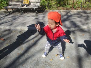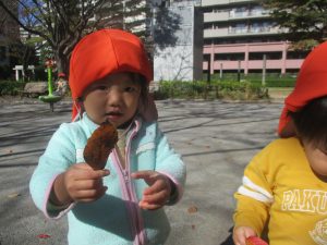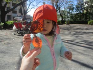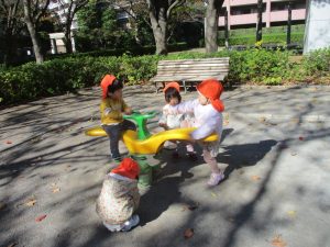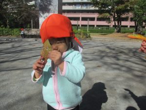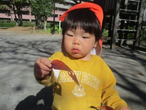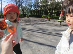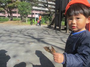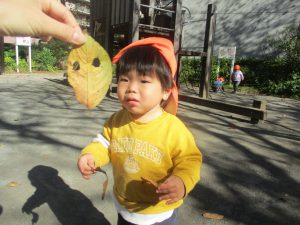 日中は皆でさくら公園にて過ごし、固定遊具を使用して思い切り体を動かしたり、様々な形の落ち葉を見つけ楽しんでおりました!