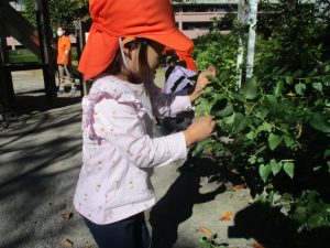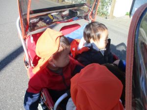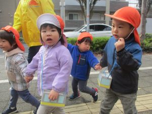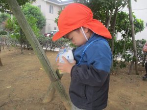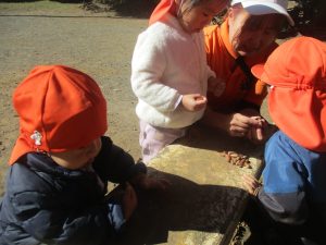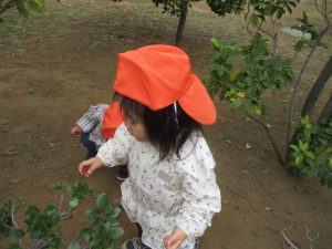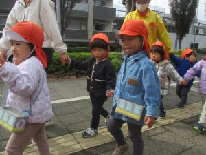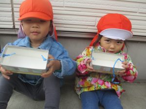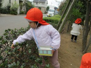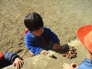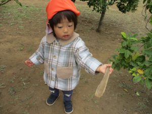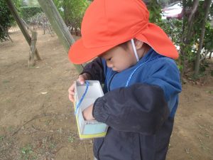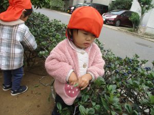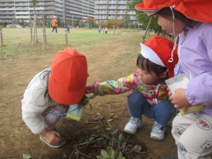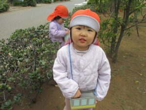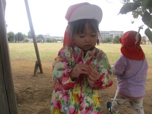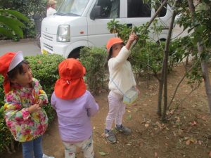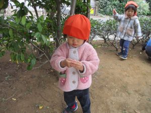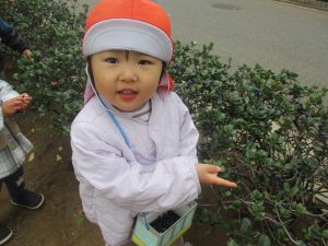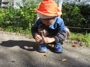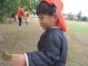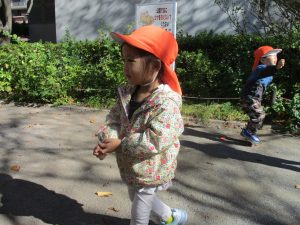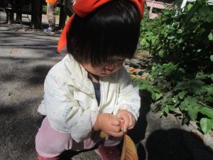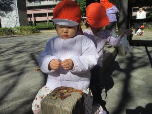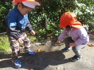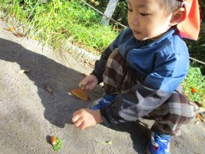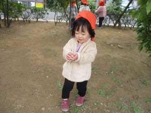 2歳児クラスのお友達は、手作りのお散歩バッグに木の実をたくさん収穫し大満足の様子でした♪