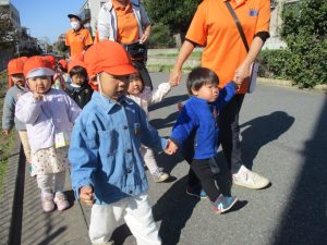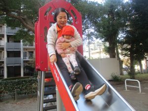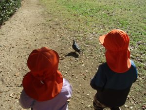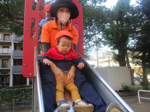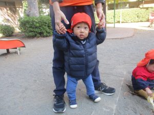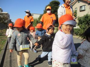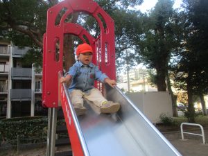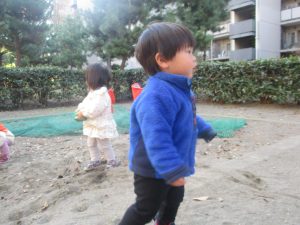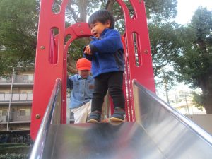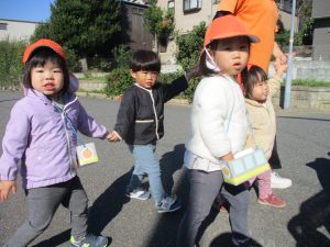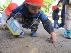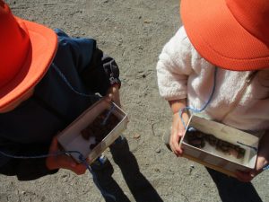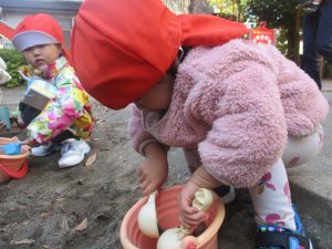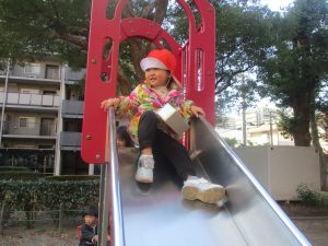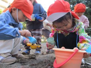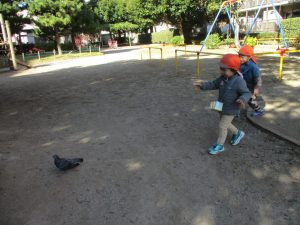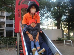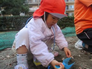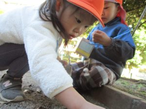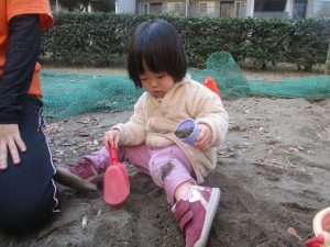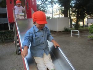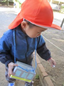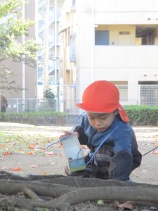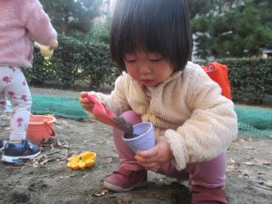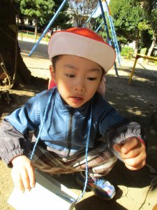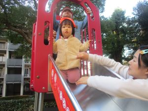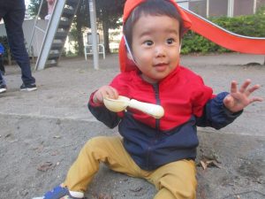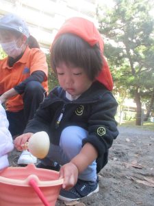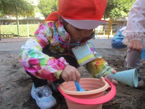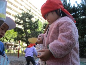 砂場でのままごと遊びを楽しんだり、すべり台を使用して思い切り体を動かしたり、お散歩バッグを使用して自然物探しに夢中でした。