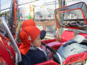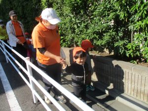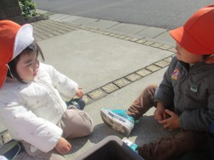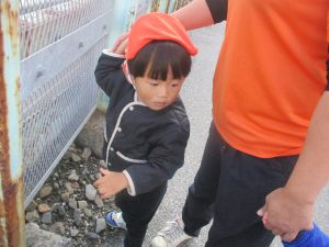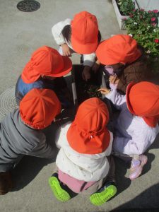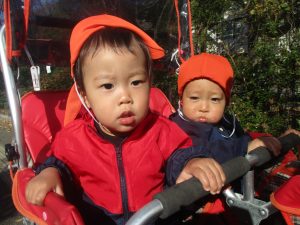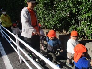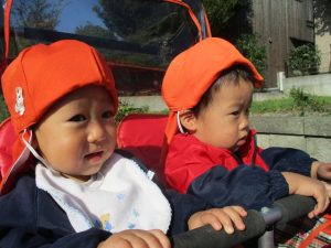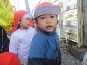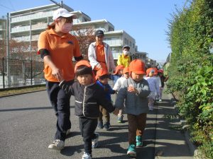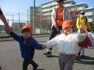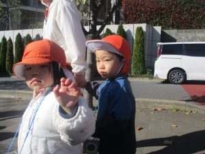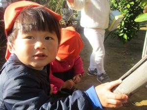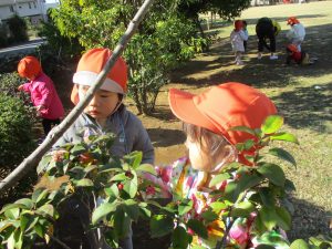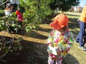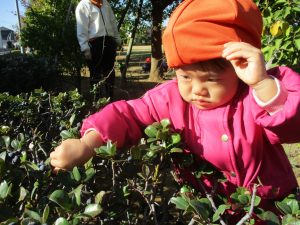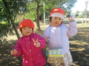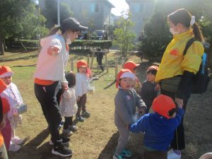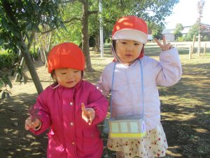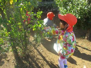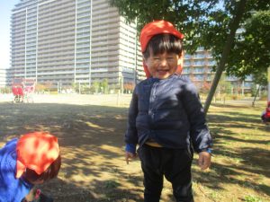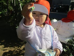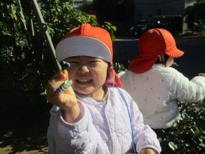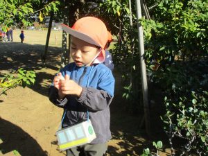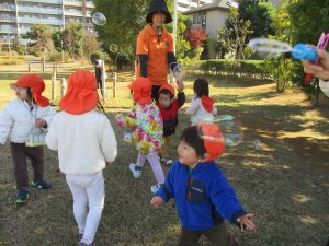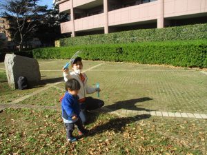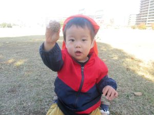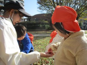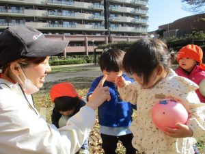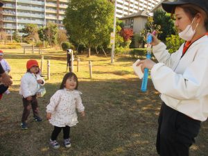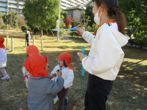 気持ちの良い秋晴れの下、木の実や葉っぱ等の自然物探しを楽しんだり、シャボン玉を追いかけてはたくさん体を動かして遊びました。