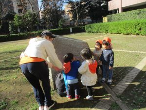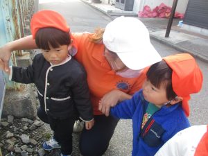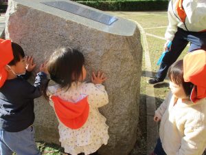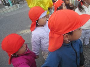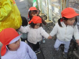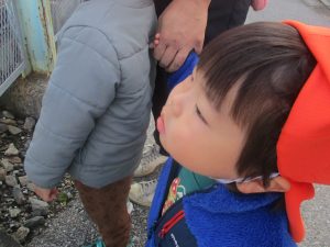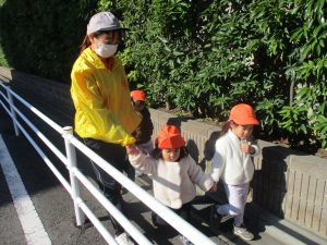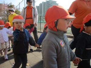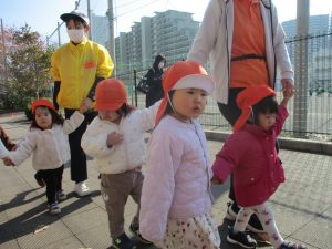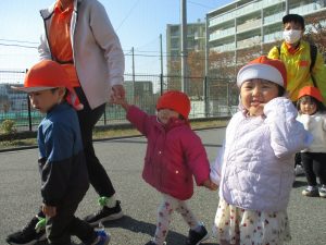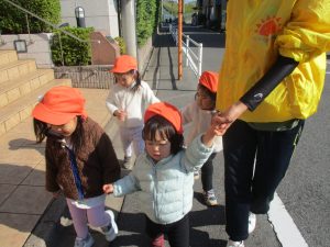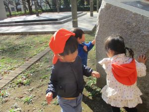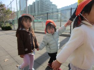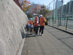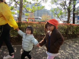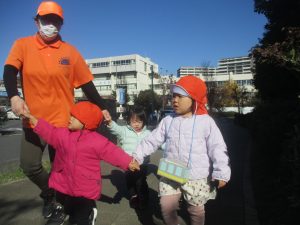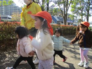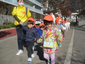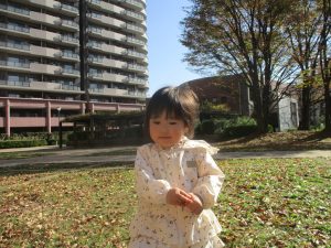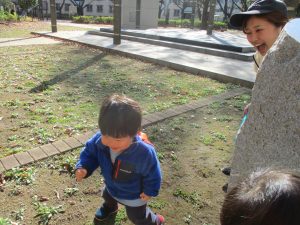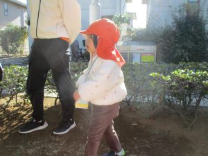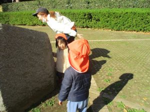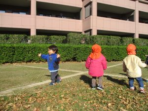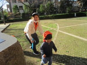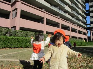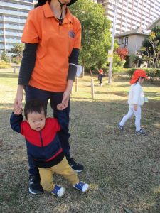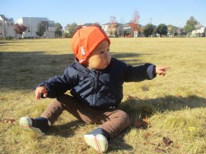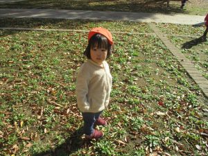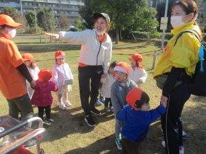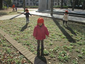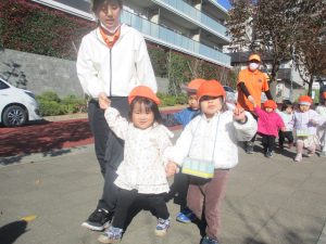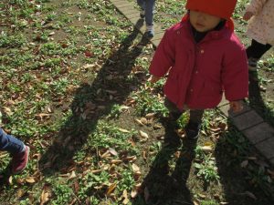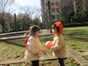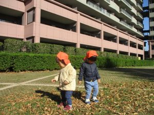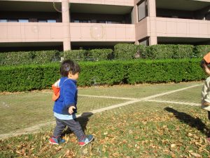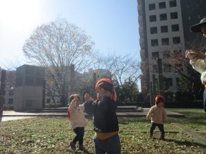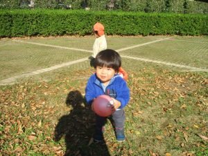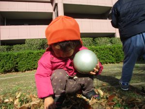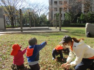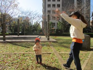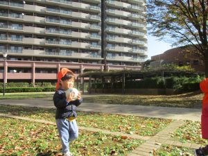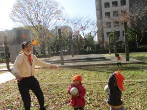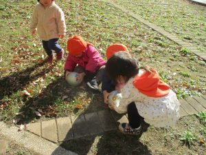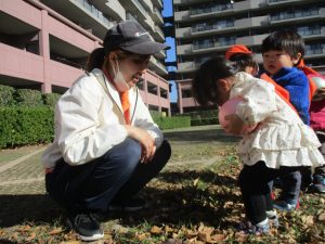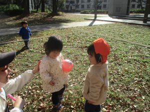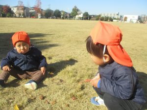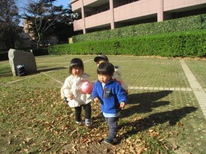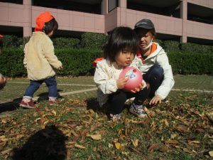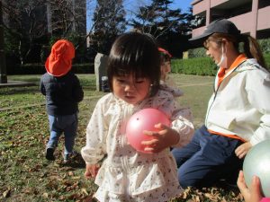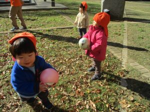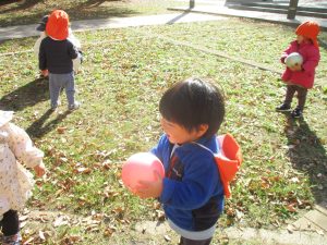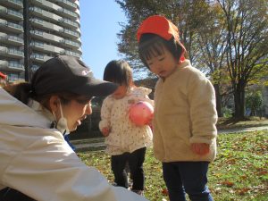 1歳児クラスは単独でさくら公園の裏で過ごし、ボールを使って体を動かしたり落ち葉集めを楽しみました♪