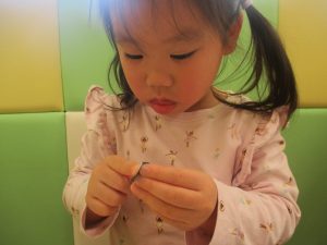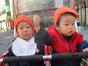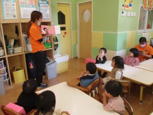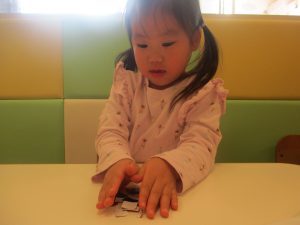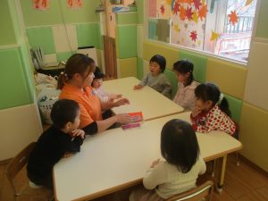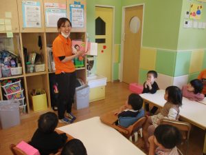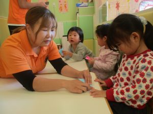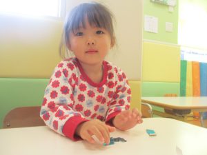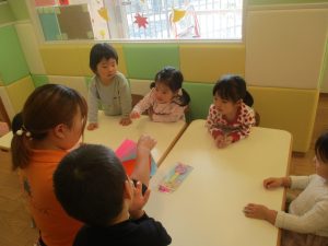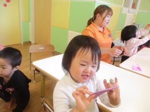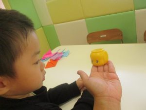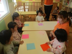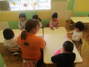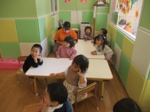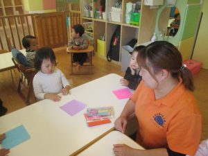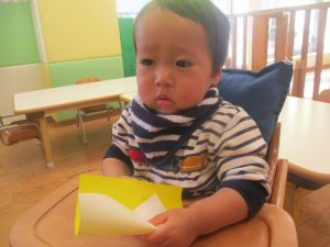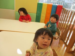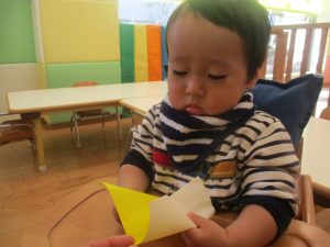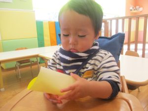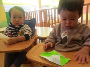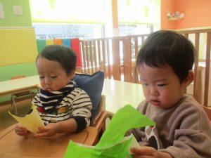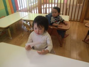 0歳児クラスのお友達は2歳児クラスのお友達の製作の様子を見学したり、広い保育室にて好きな玩具を見つけ、ゆったりと過ごしました。