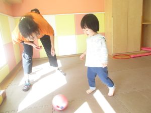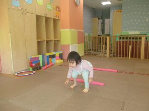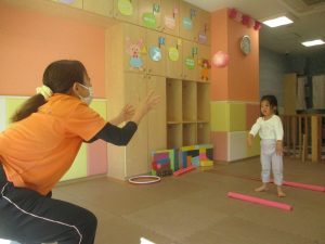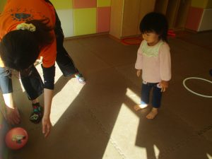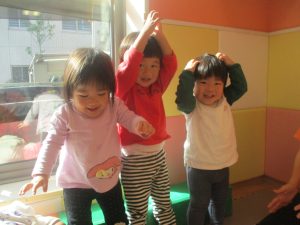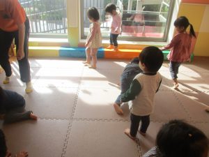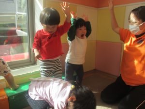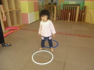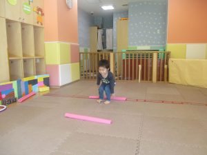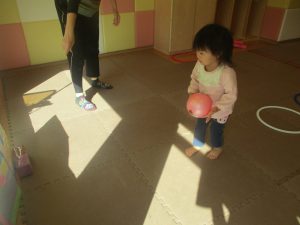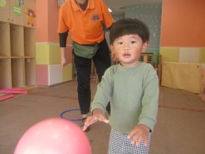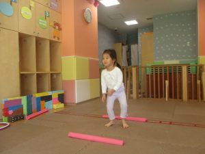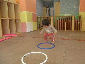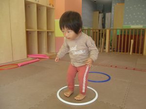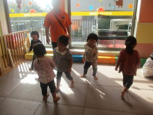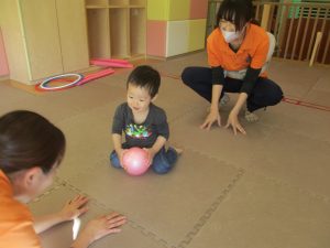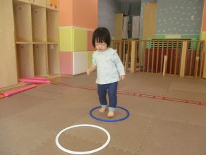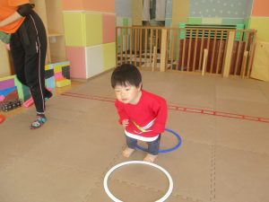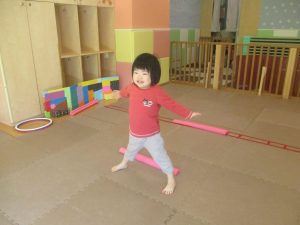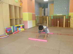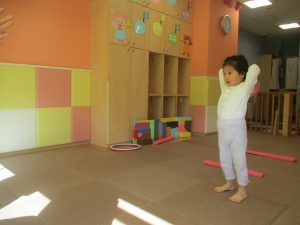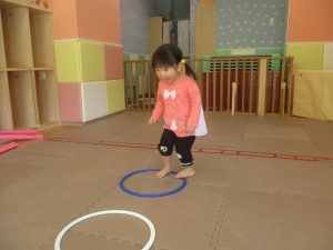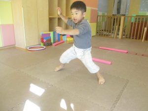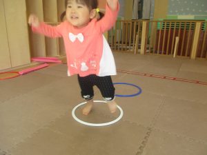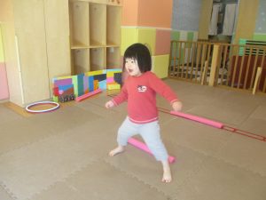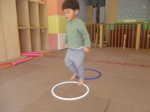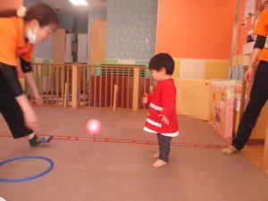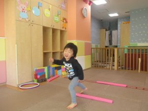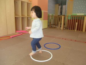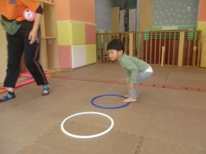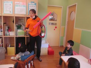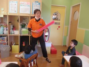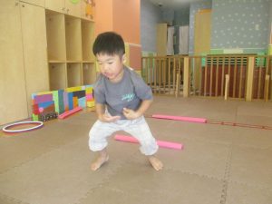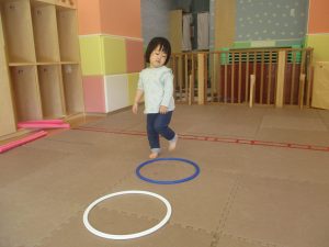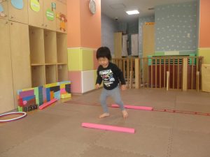 今月の体操では、プールに浮く発砲ポリエチレンをアレンジして使ったミニサーキットや先生の笛の音に合わせてジャンプをする活動で盛り上がっております♪