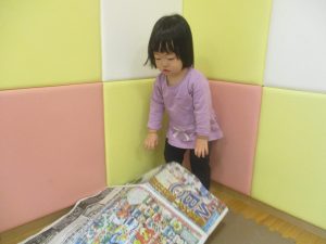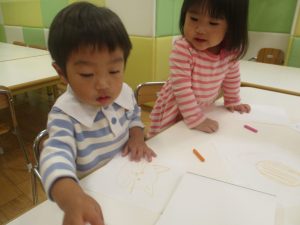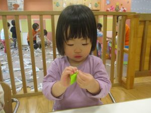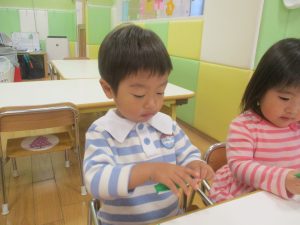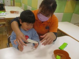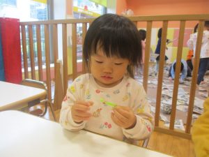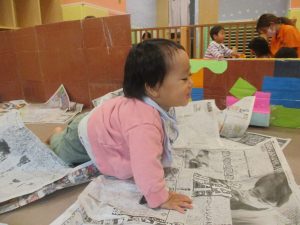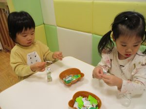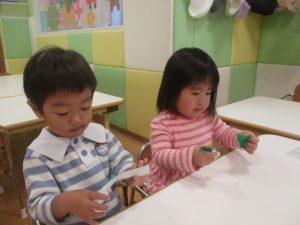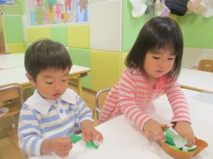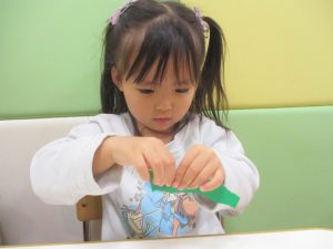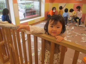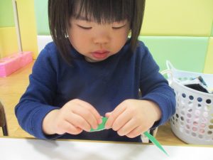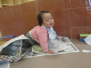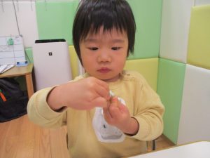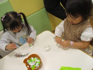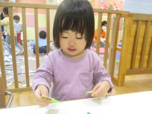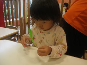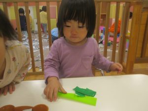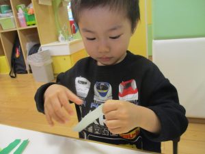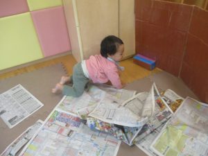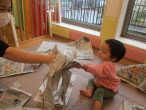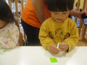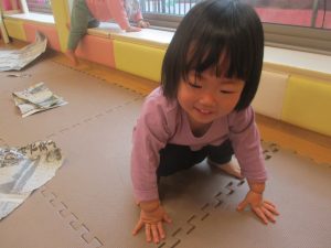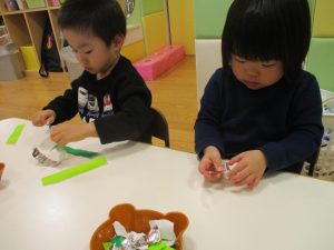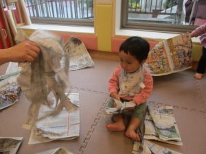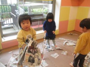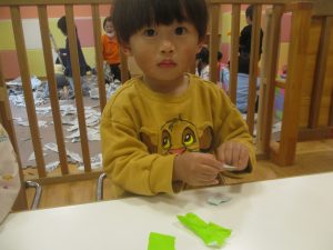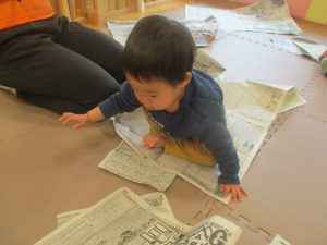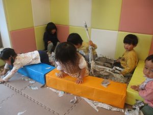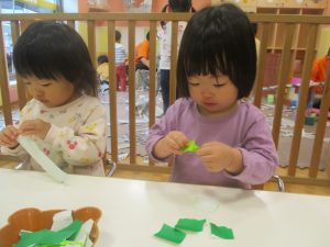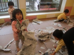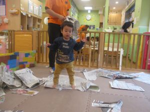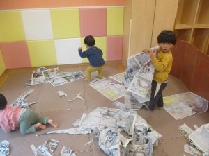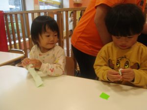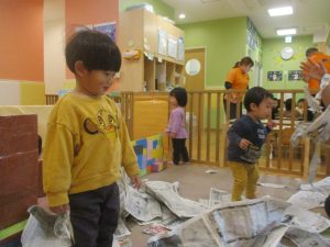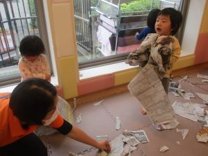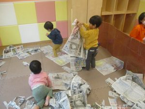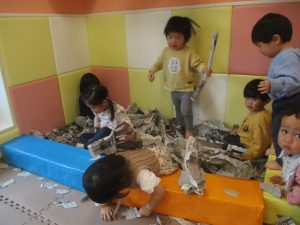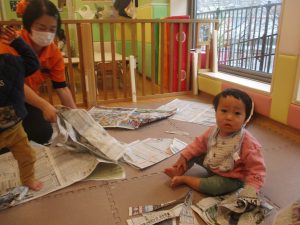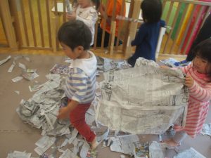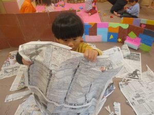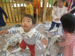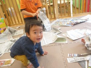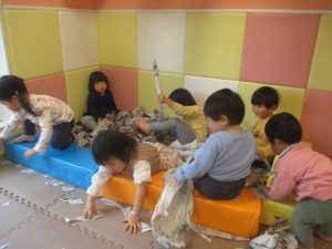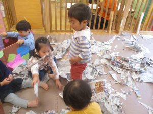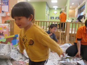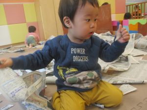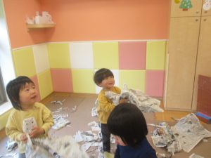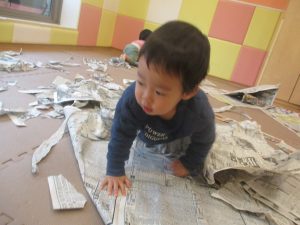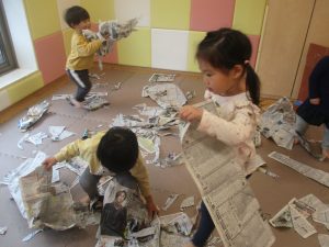 折り紙や新聞紙を「ビリビリ」と破いては思い思いの作品を仕上げておりました。