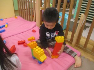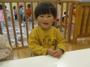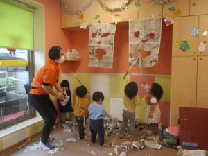 日中は雨天の為、室内にてクリスマス製作や新聞紙遊びを楽しみました!