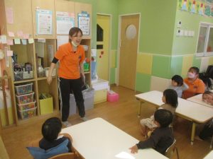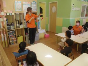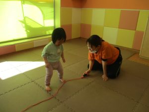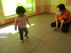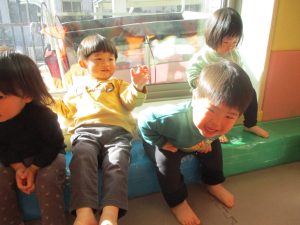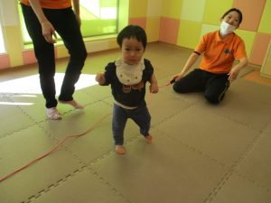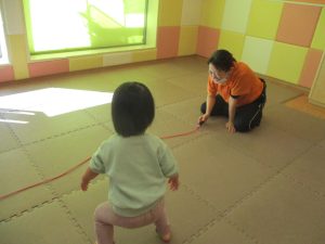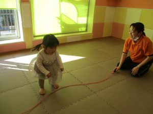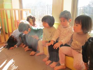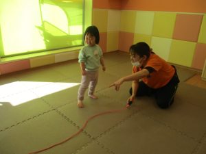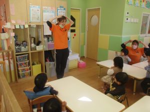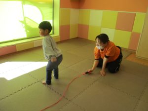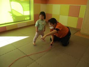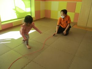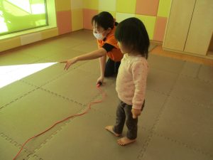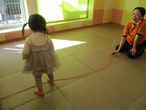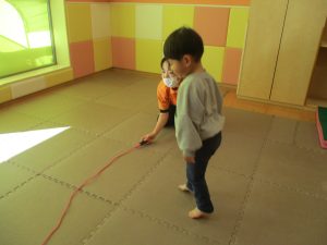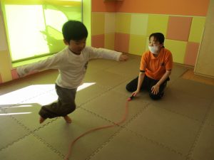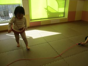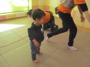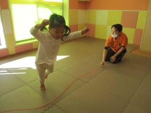 今月の体操では、動いている縄を使ったジャンプや2歳児クラスのお兄さんお姉さんを中心にした”前転”に挑戦をしをしてみました。