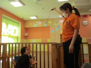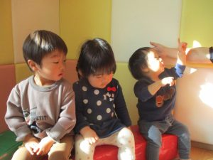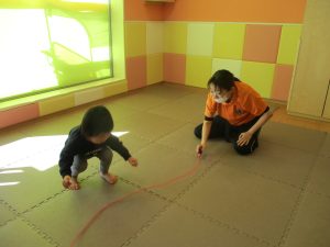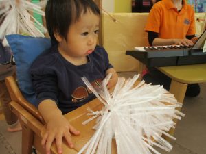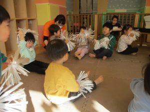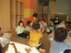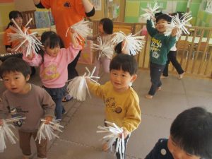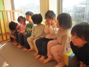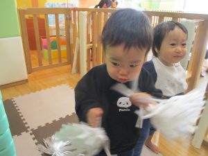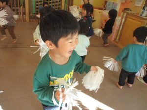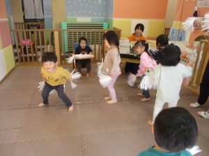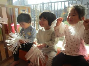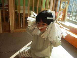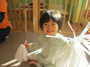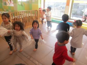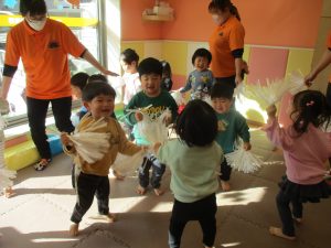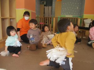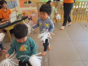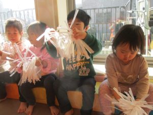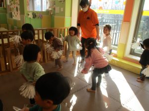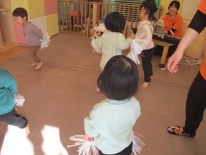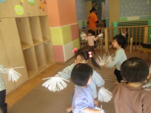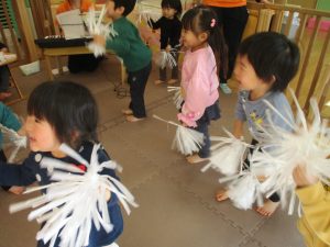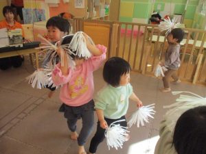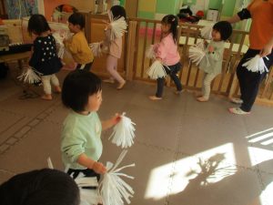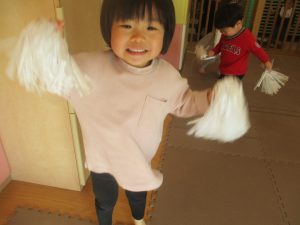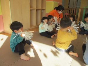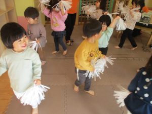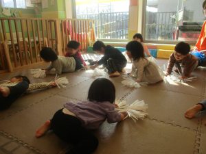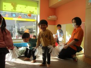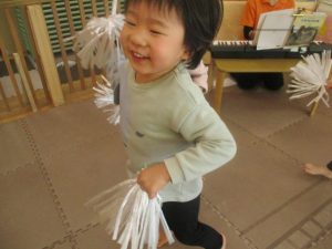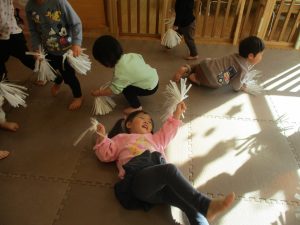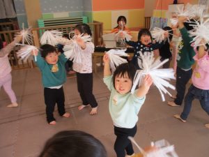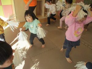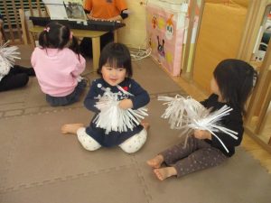 1月のリトミックでは、雪に見立てたのポンポンをそれぞれが手に持ち「ゆき」の歌に合わせて雪になりきってみたり、流れてくる音楽に合わせていろいろな動きを表現してみたり、様々な身体表現を楽しんでおります。