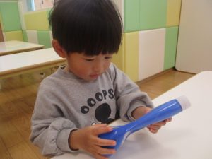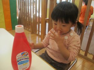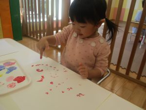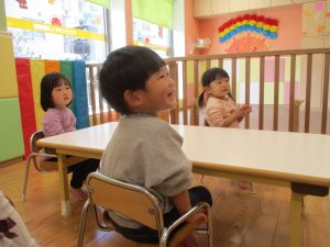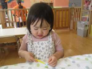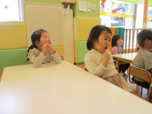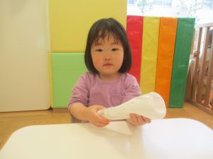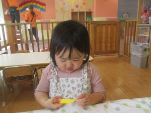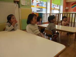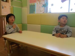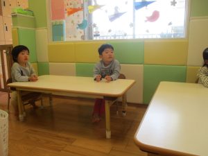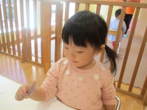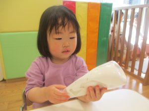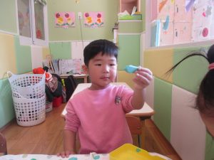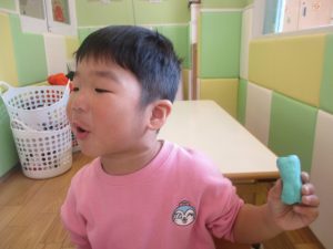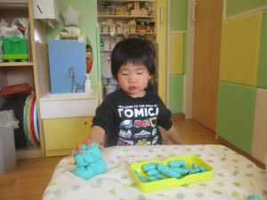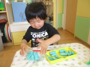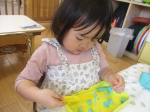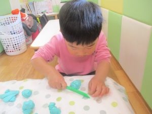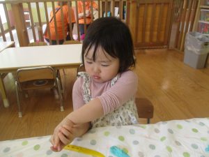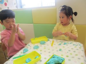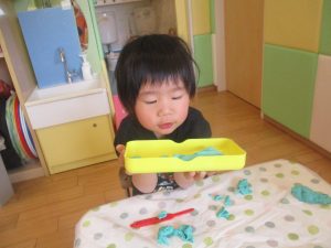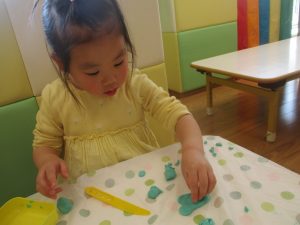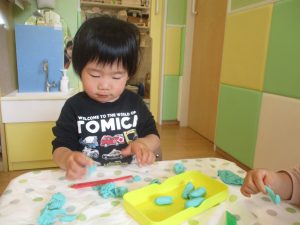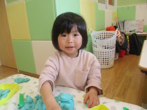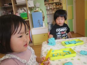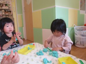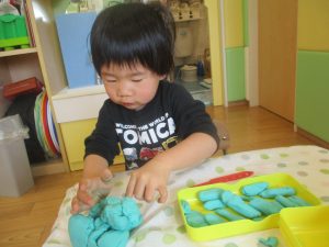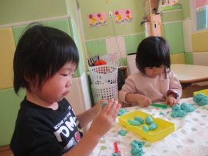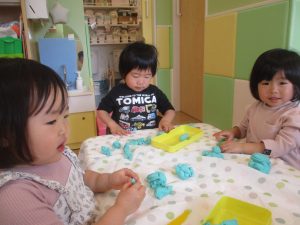 2歳児クラスのお友達は卒園式練習後、室内にて粘土遊びを行いました。