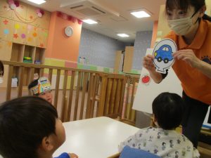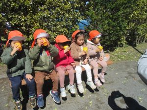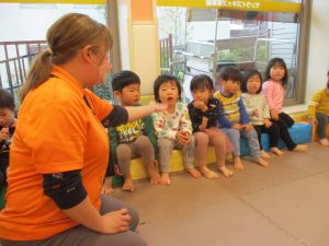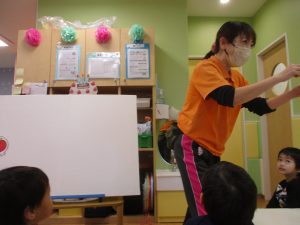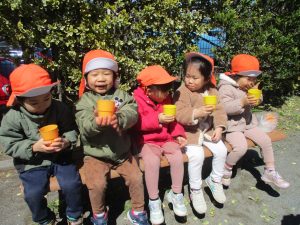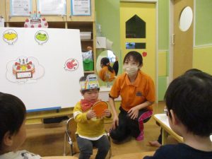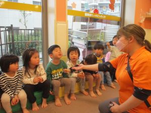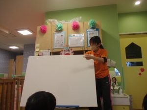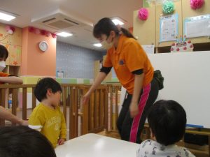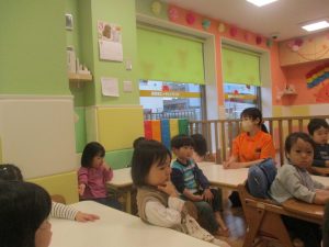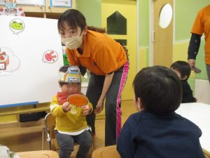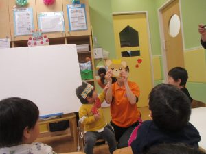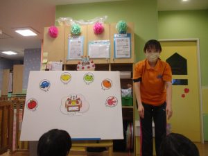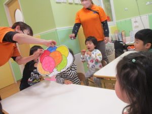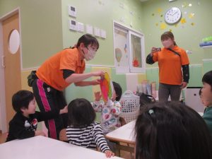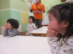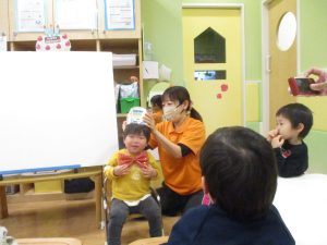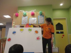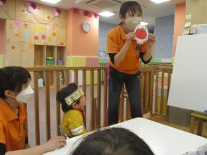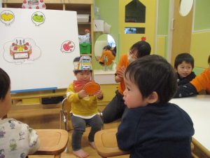担当の先生の出し物も楽しそうに見ており、最後はお気に入りのオレンジを大事そうにもっておりました。