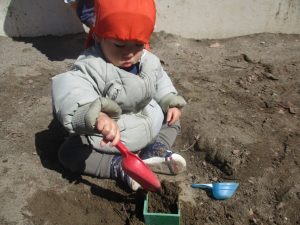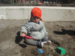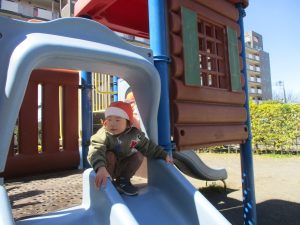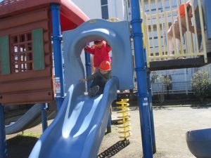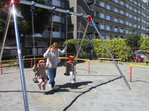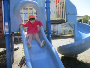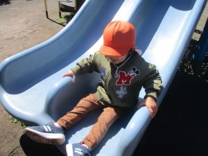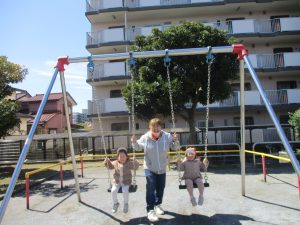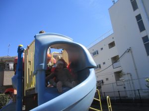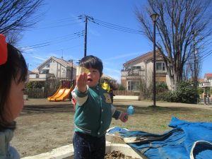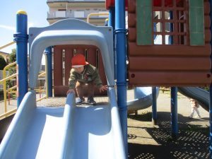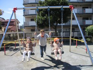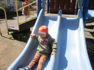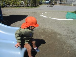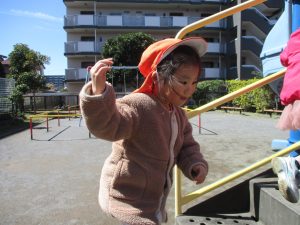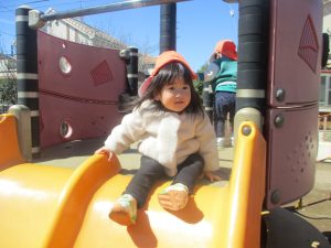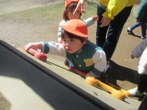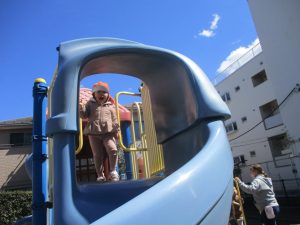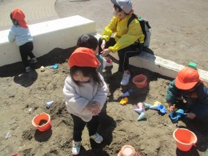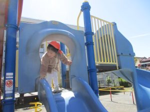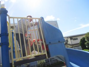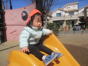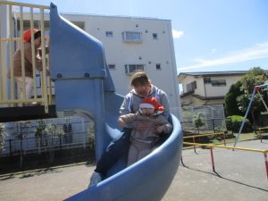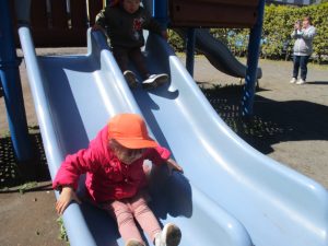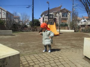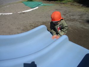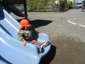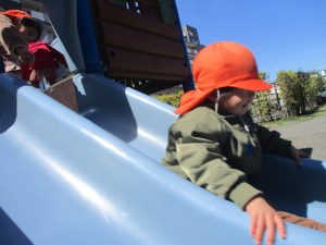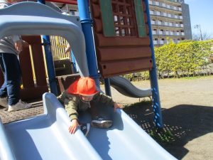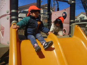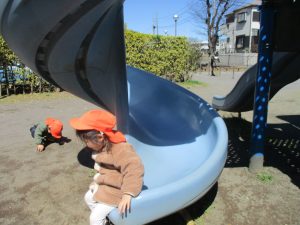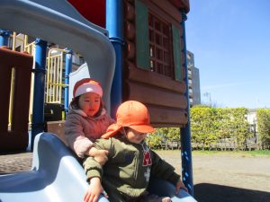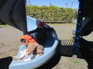 0.1歳児クラスはけやき公園、2歳児クラスは5丁目公園にて固定遊具を使用したくさん体を動かしたり、砂場でのままごと遊びに夢中でした!