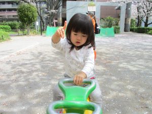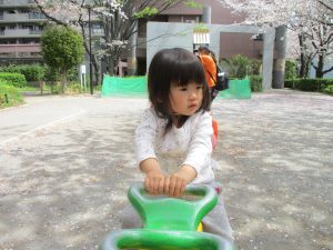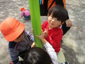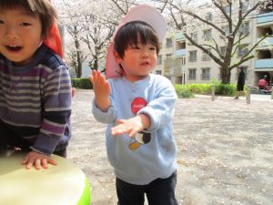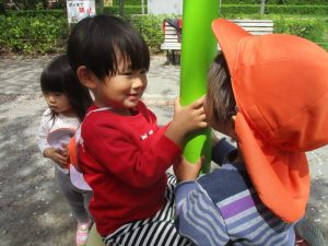 2歳児クラスのお友達はさくら公園にて、遊具を使用して楽しそうに体を動かして遊びました。