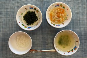 (写真は普通食です。年齢によって盛り付け量を変えて、提供しています。)