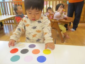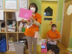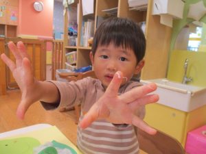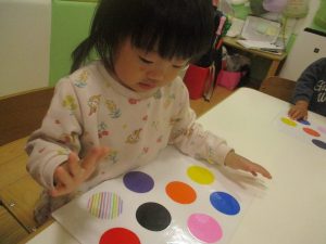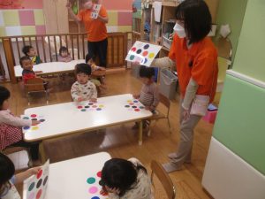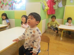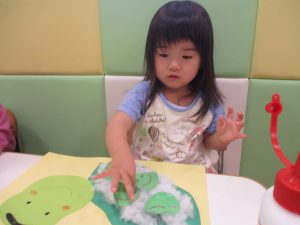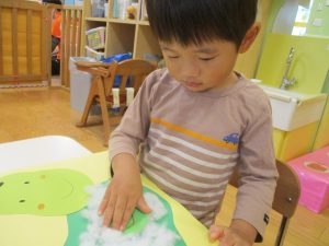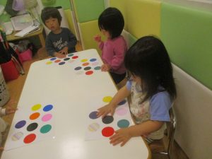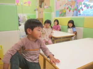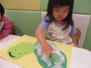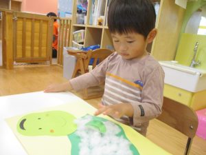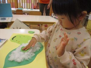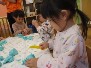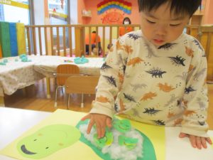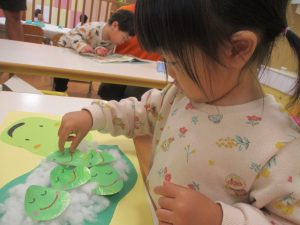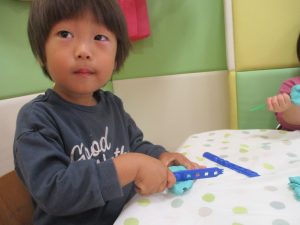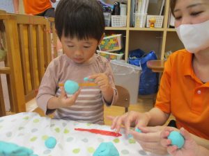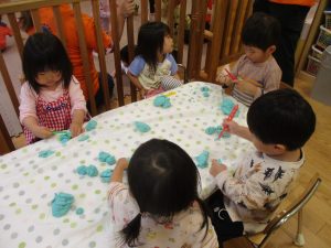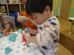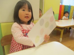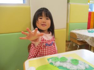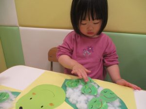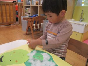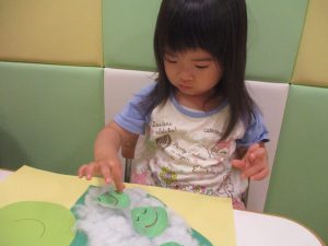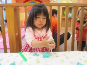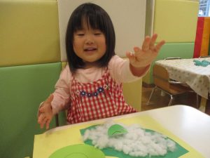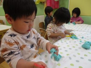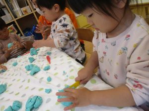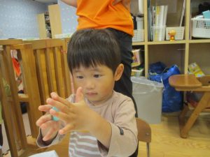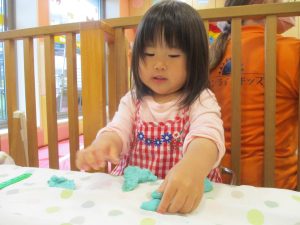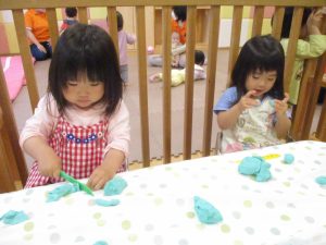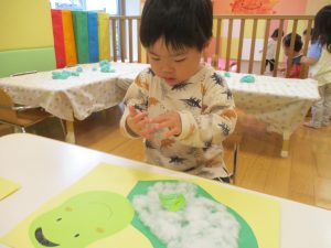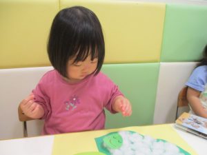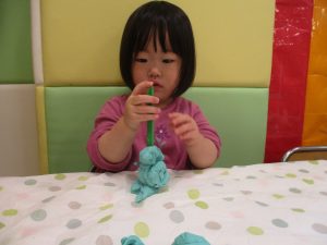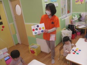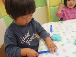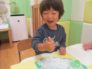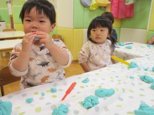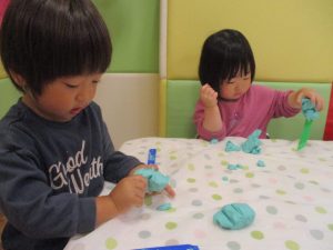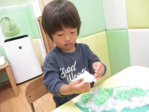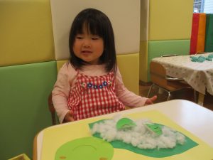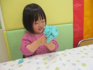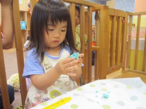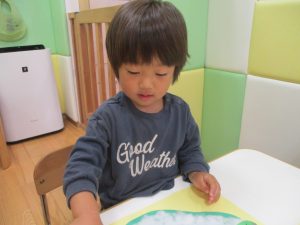 製作や粘土遊び等の机上遊びを楽しんだり、広い保育室でゆっくりと過ごさせて頂きました。