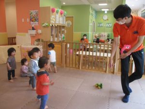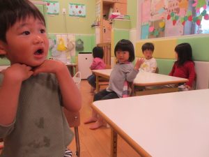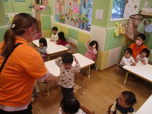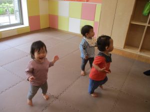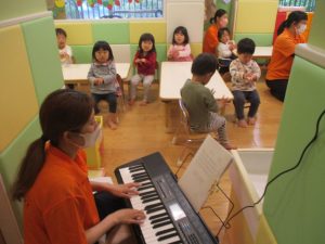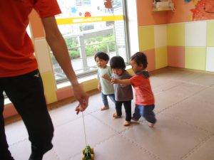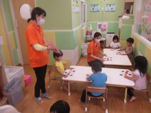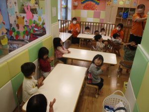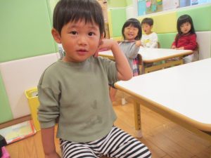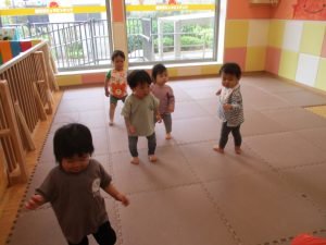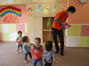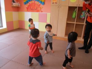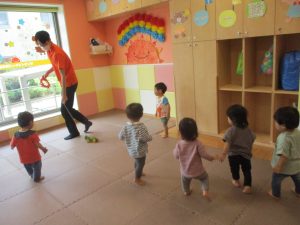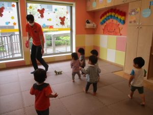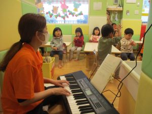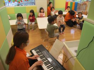 今月のリトミックでは、「こいのぼり」や「ぶんぶんぶん」など季節の歌を歌ったり、「かえるのうた」や「きらきらぼし」などの歌のテンポや大きさを少し変えて歌ったり、曲のアレンジも楽しんでいるところです。