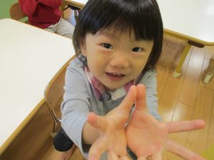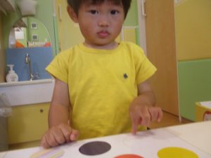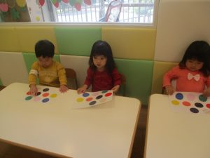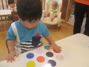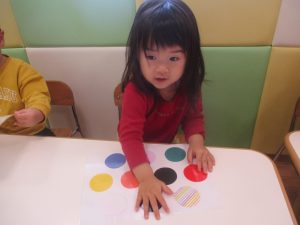 カラーフラッシュカードや保育者とのクイズ形式で色の英単語を覚えていったり、「Color Touch Song」と言う曲に合わせていろいろな色を見つけたりする活動を行っております☆「Red」と聞こえてくると赤い色を選んで「タッチ!」が日に日に上手になってきましたよ~♪