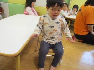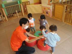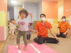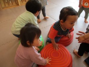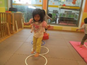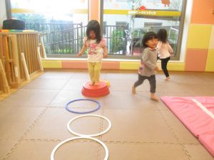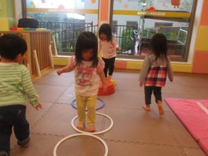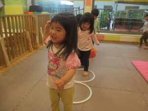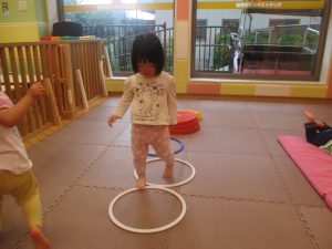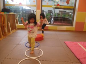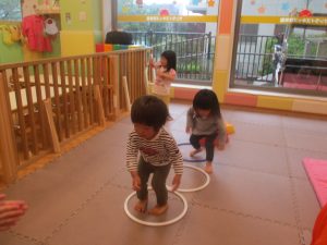 2歳児クラスのお友達は、フープやバランスストーンを使ってジャンプをしたり、うさぎやかえるなどいろいろな生き物に変身をして体を動かしたりする活動にも挑戦しております♪