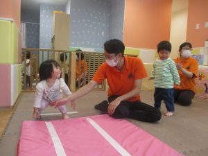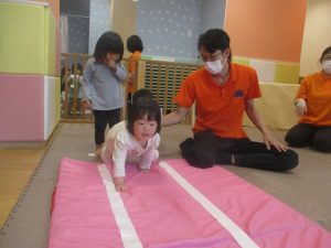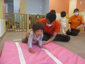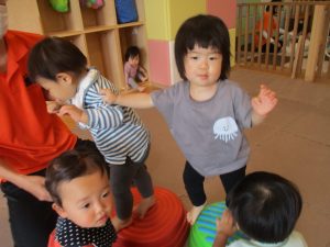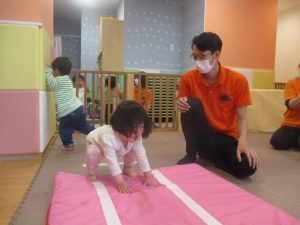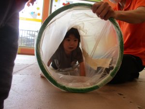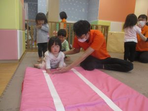 0.1歳児クラスのお友達も一生懸命お山登りやトンネル潜りにチャレンジ中です!