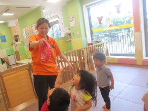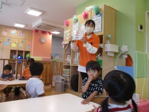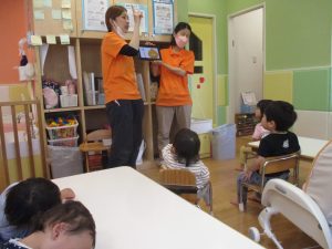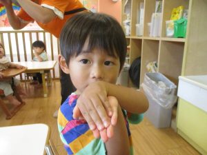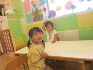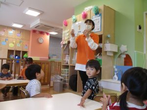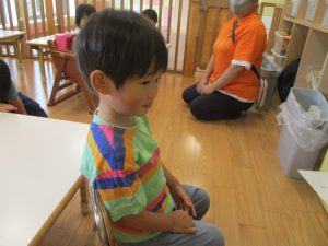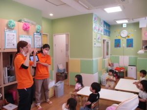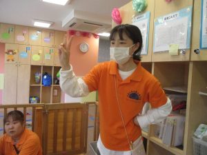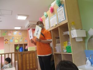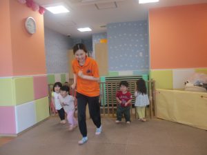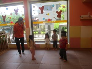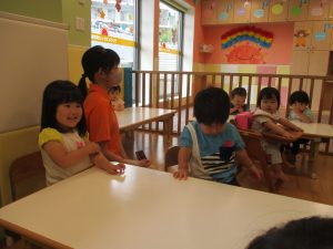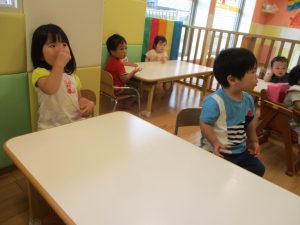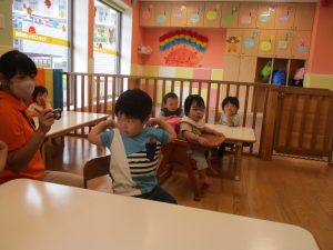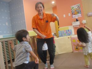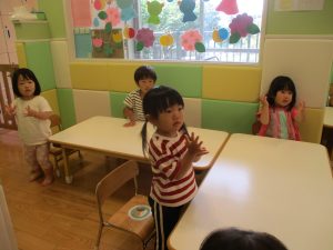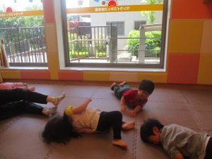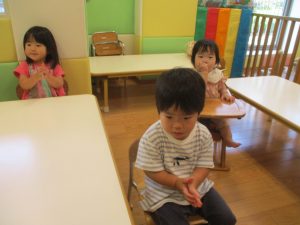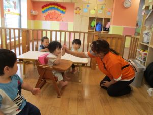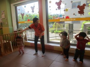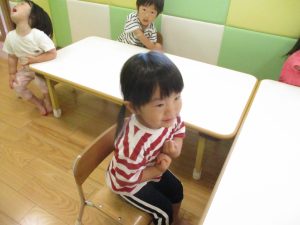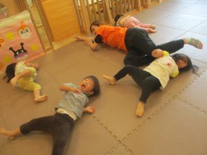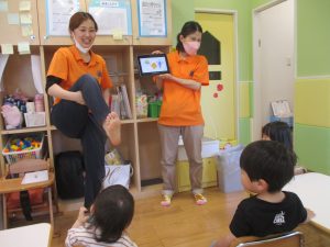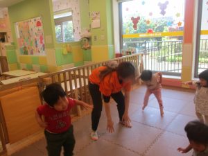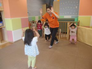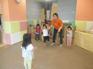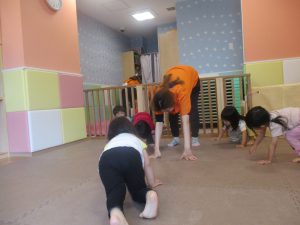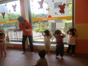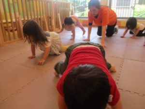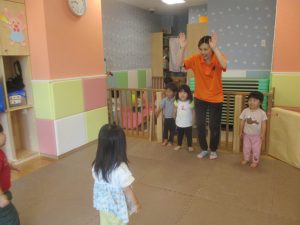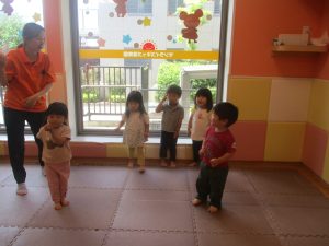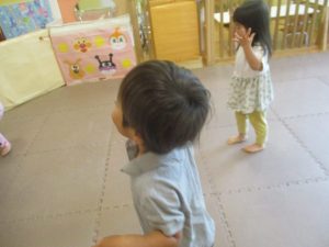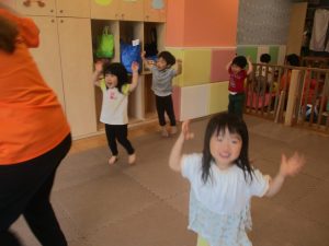 今月の体操では2歳児クラスと1、2歳児クラスで別れて活動をしております。