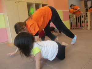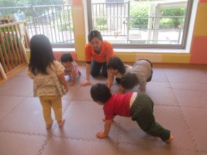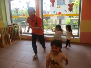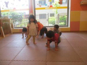 2歳児クラスのみんなは、先生と一緒に「よーいどん!」とかけっこをしたり、いろいろな動物に変身をしたりして(動物模倣)様々な動きや歩き方に挑戦中!
