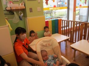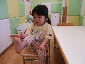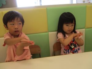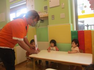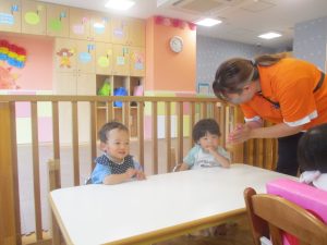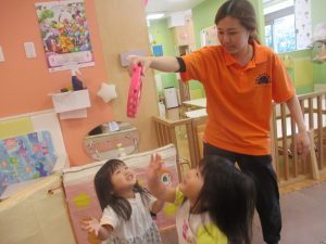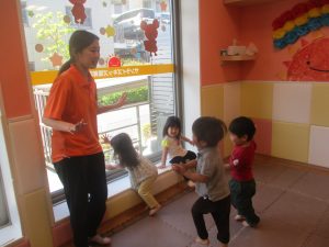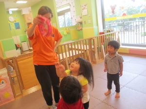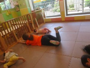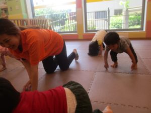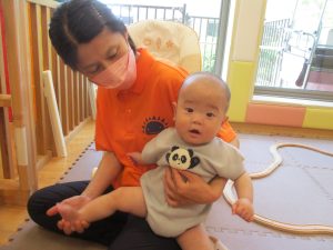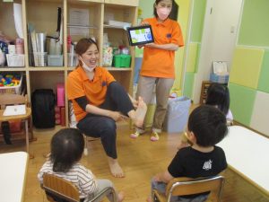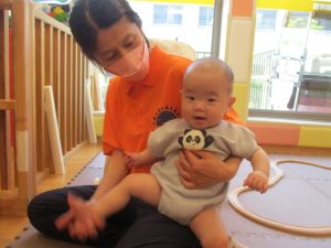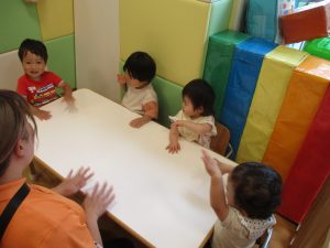 0歳、1歳のお友達も先生と一緒に手や足に触れて英語の音楽を楽しんでおります!