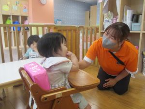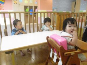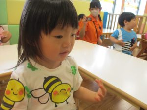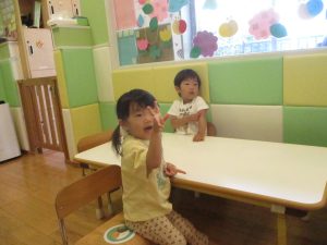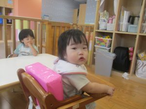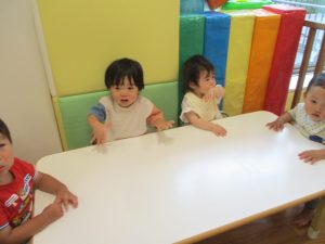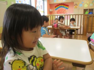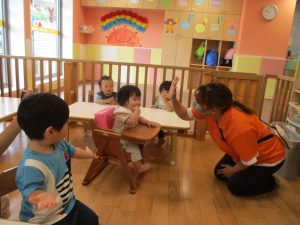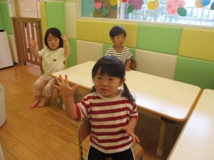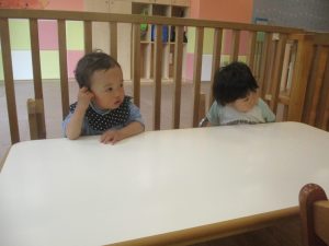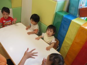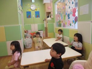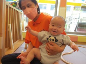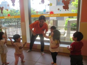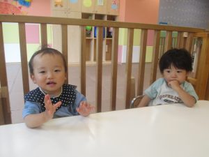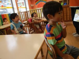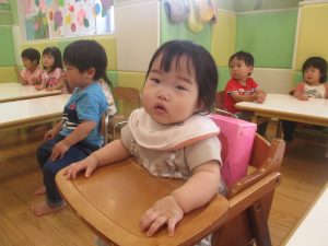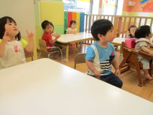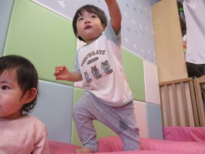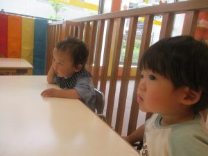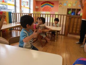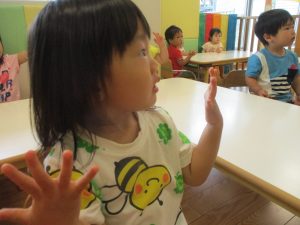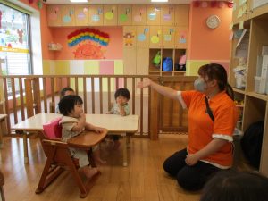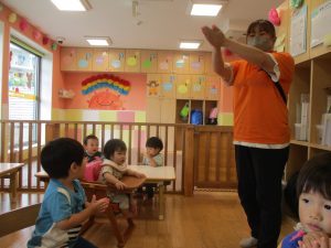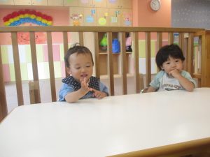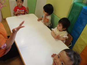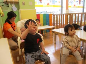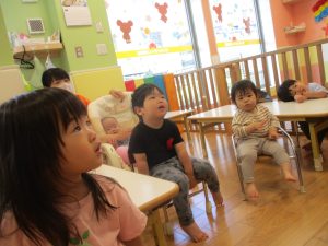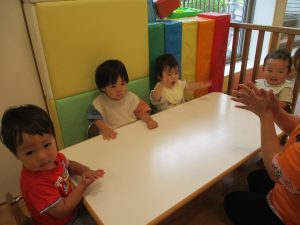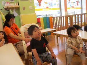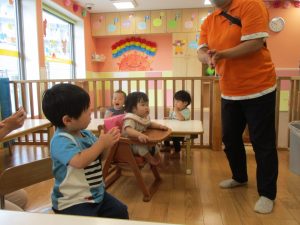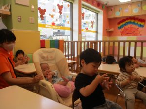 2歳児クラスのお友達の元気な歌声や盛り上がりの声には0、1歳児クラスのお友達も興味を持ったり、一緒に盛り上がったりできるようになって参りました♪