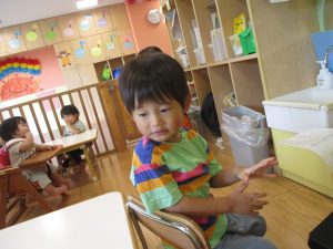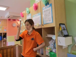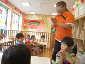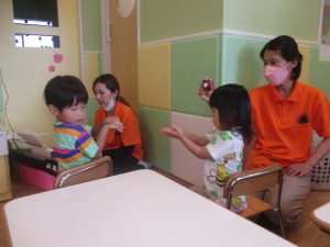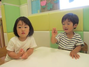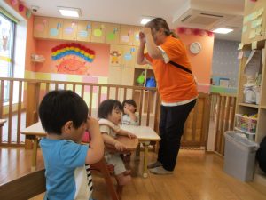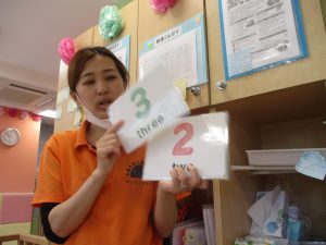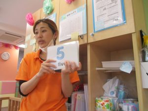 先生と一緒にフラッシュカードを使って覚えたり、「How Many Finger」と言う手足の指を数える曲をみんなで楽しんだりしております♪