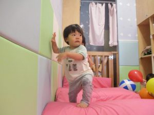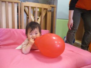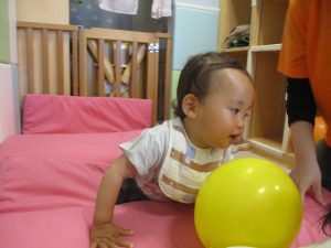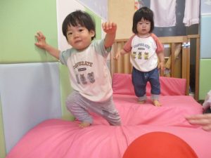 0、1歳児クラスのみんなはゆったりとした雰囲気の中でマット山や風船遊びを楽しんでおります♪