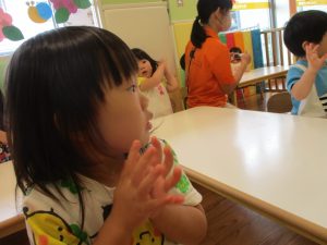 今月のリトミックでは、お子様達も大好きな「かたつむり」の歌や、「しずかなこはん」と言う童謡に合わせて手拍子を付け、2拍手を感じるという活動を始めました☆