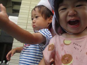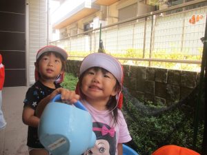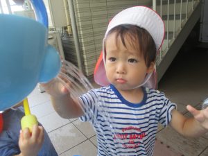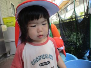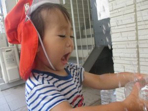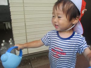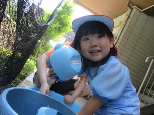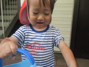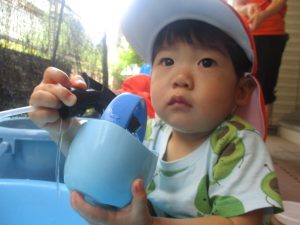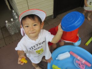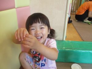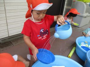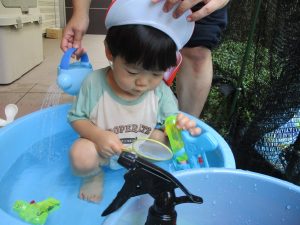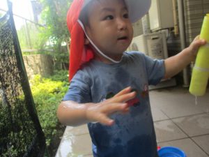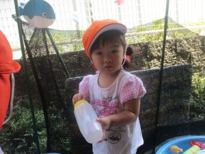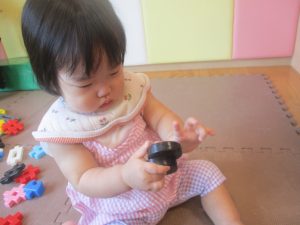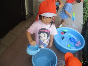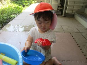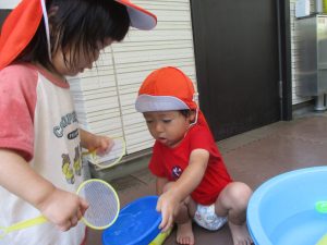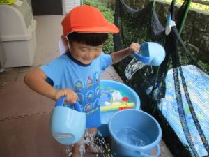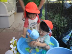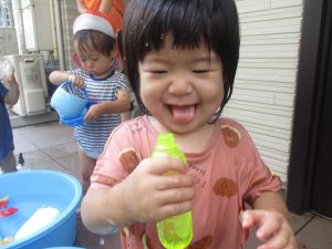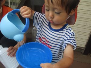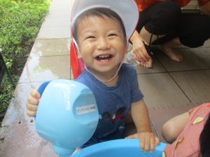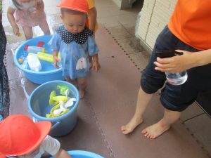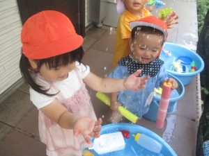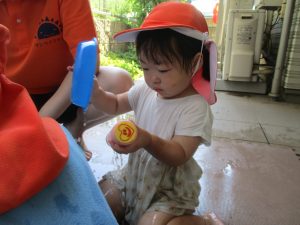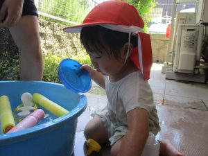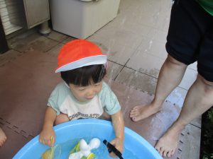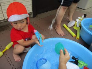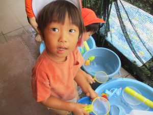 だんだんと遊び方も豪快になり、タライの中で遊ぶ子も出始めて参りました。