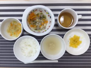 (写真は離乳後期食です。年齢によって形、固さ、盛り付け量を変えて提供しています。)