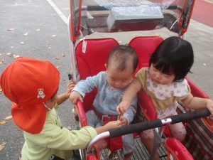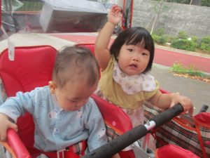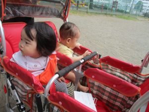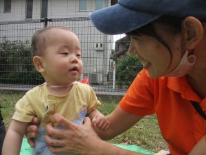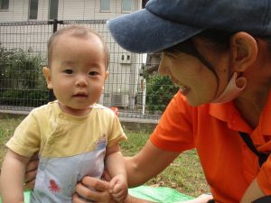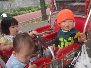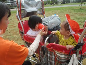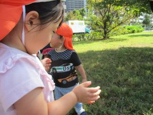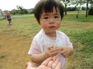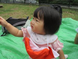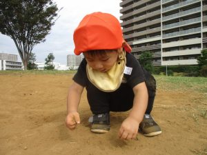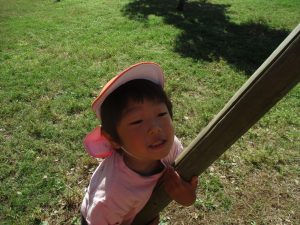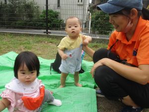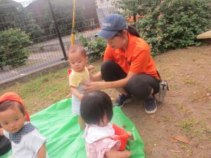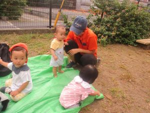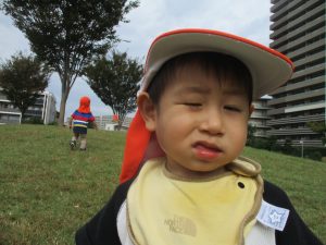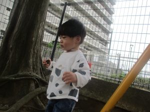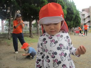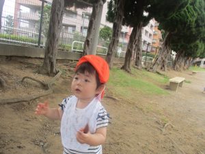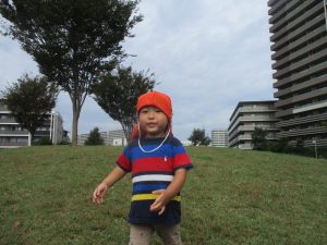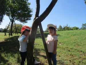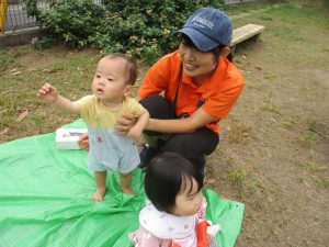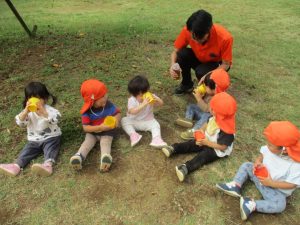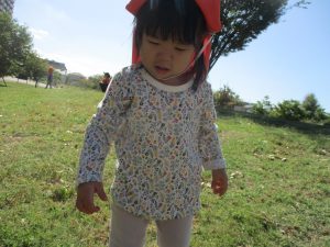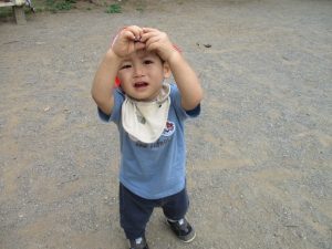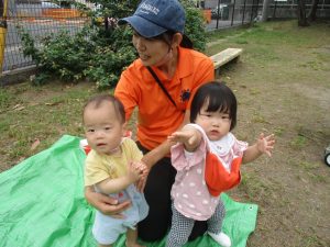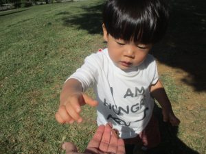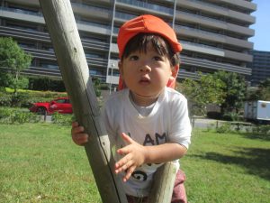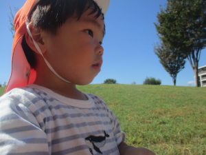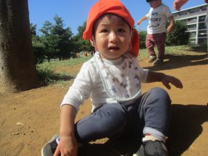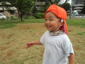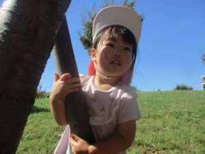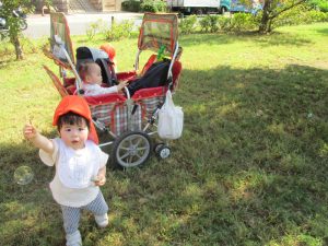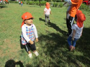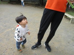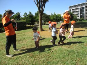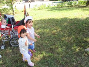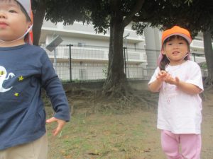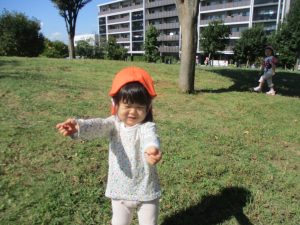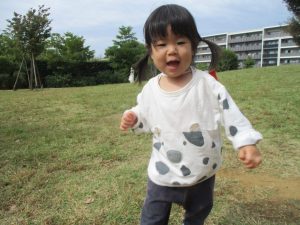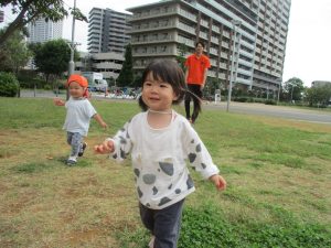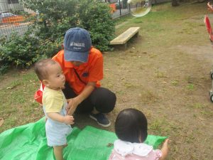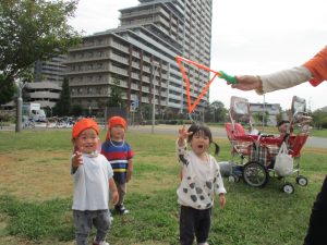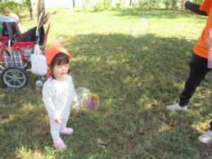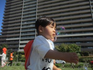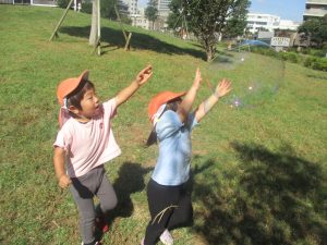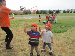 気持ちの良い青空の下、広場で追いかけっこを楽しんだり、シャボン玉を追いかけたくさん体を動かして遊びました!