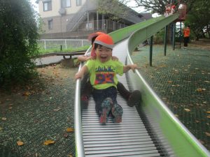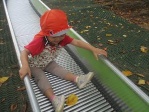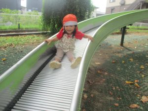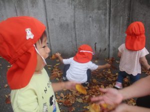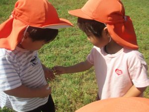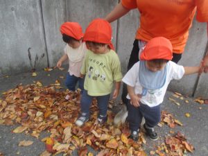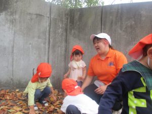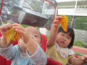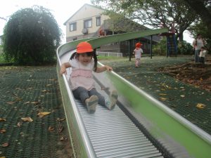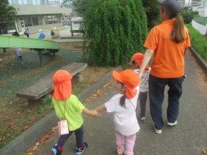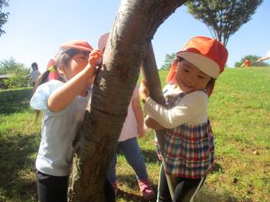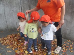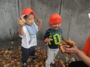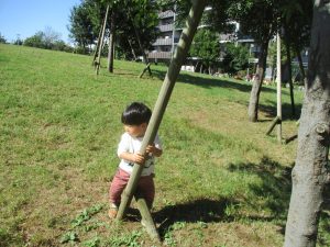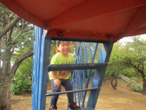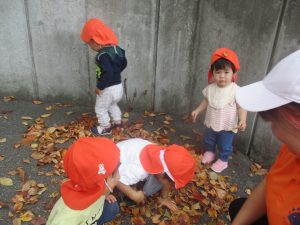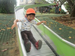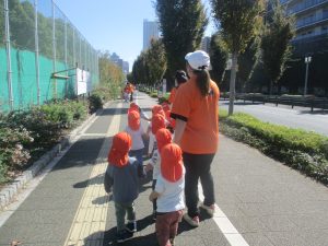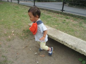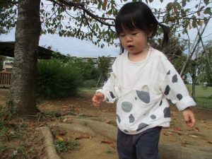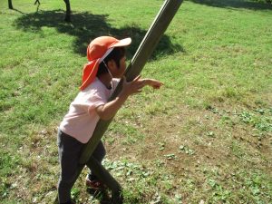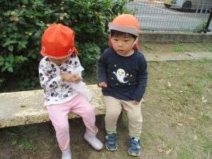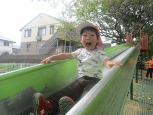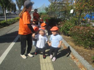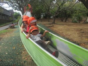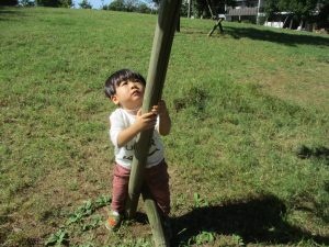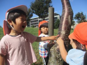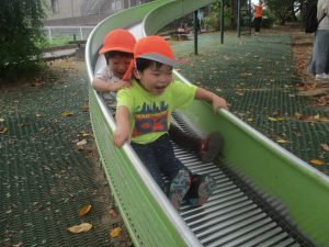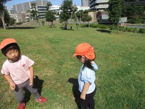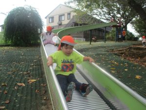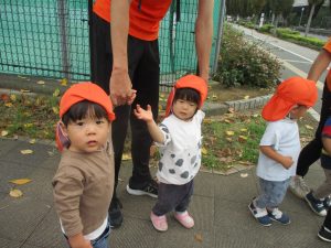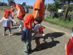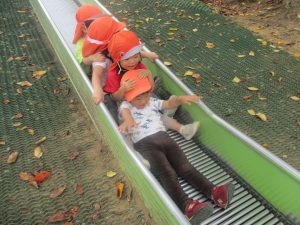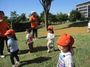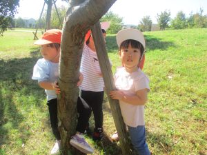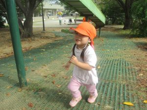 秋らしくとても過ごしやすい気候の中、公園内を散策したり固定遊具を使用してたくさん体を動かして遊びました。