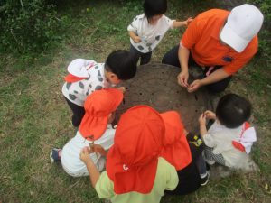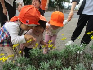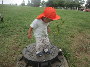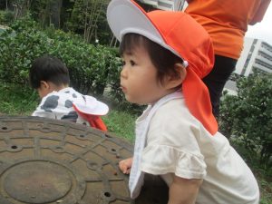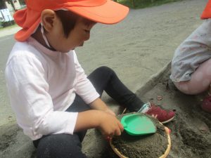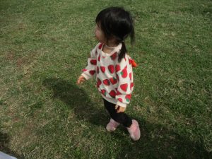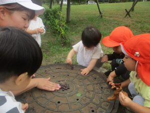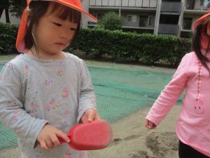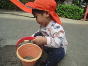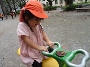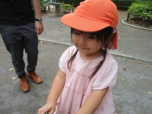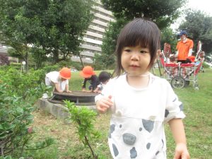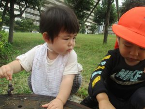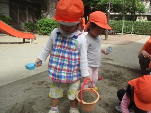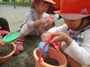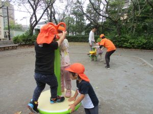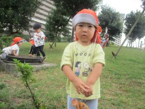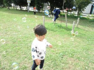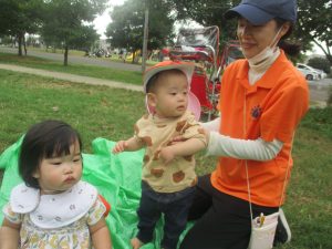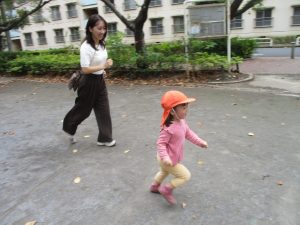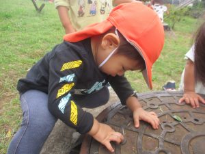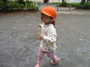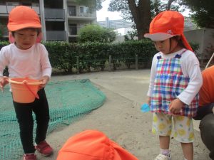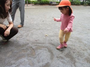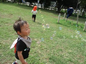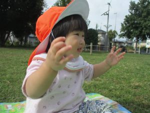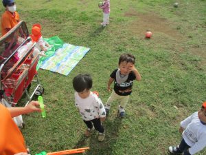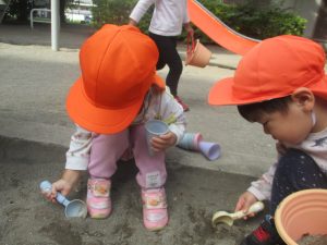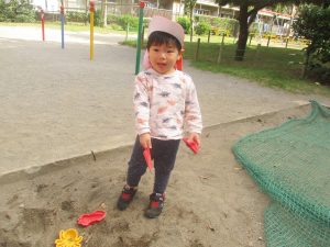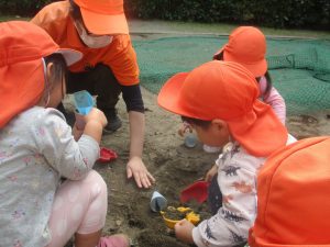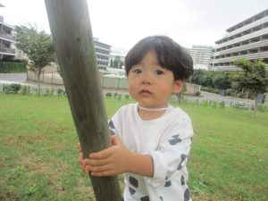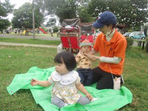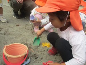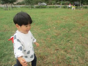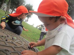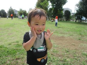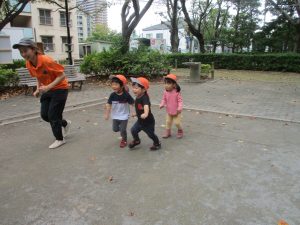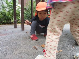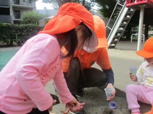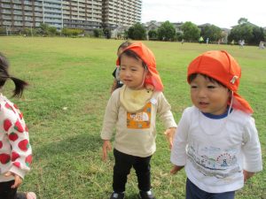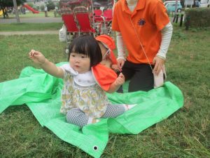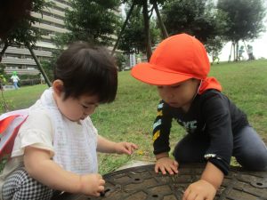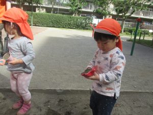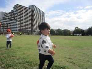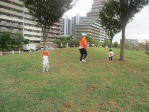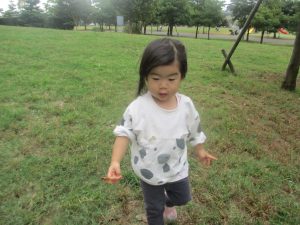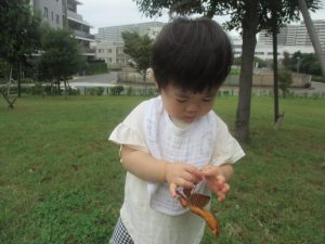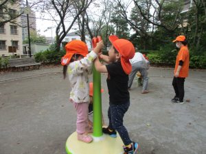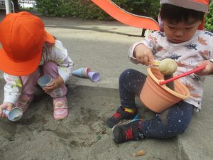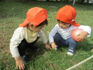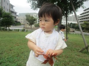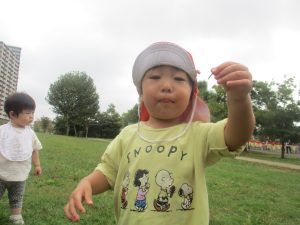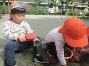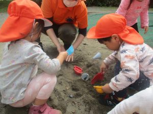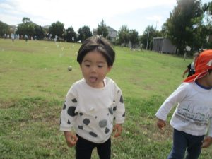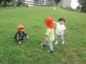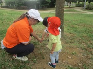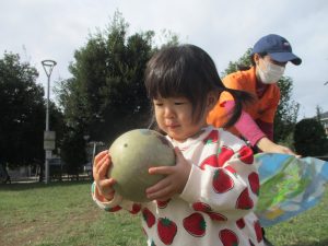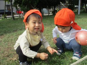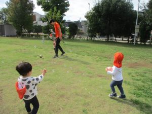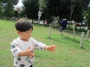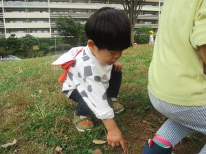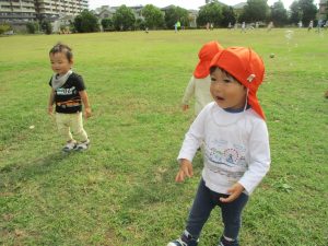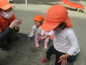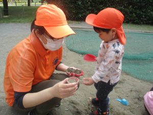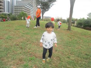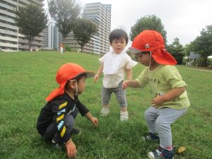 公園の広場で追いかけっこを楽しんだり、自然物探しや砂場でのままごと遊びに夢中でした。