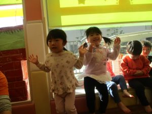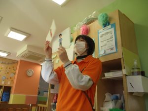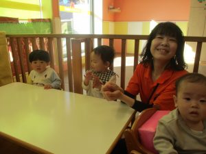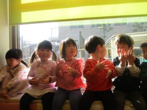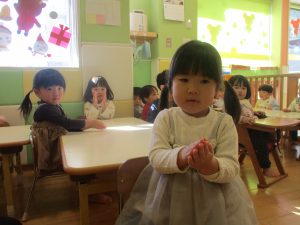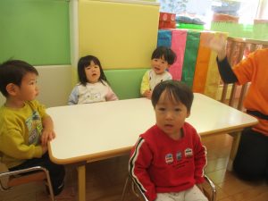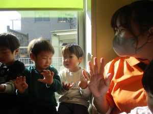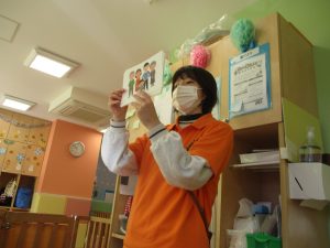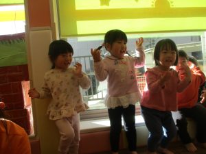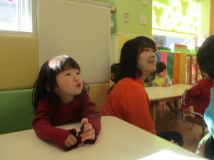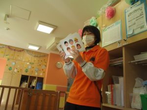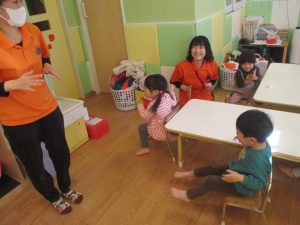 保育園にいる仲間や家族(family)、の呼称をカードを使って覚えたり、「Baby Shark」と言うサメの家族の登場する曲に合わせて踊ったりして楽しんでおります。