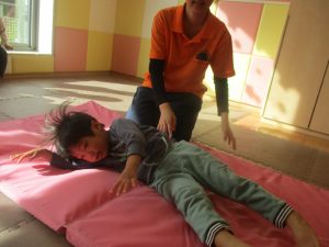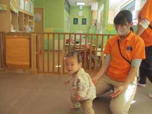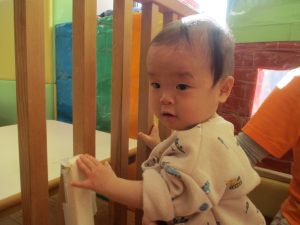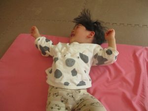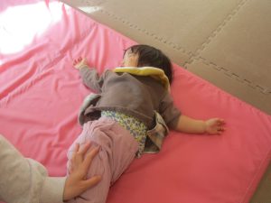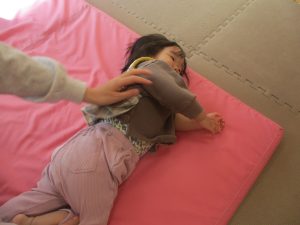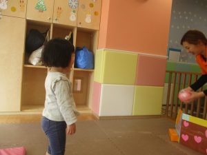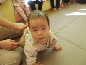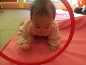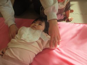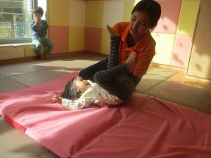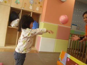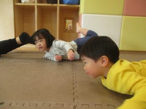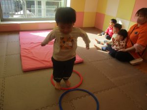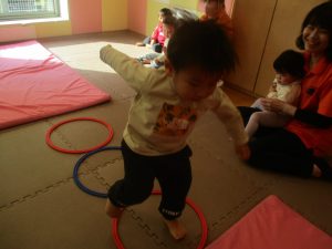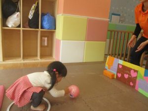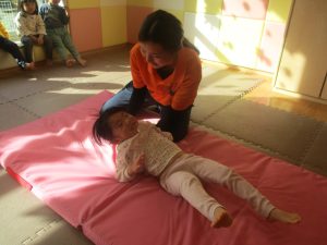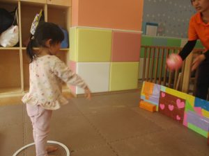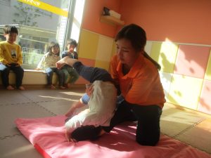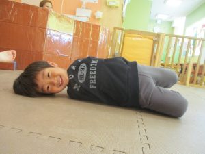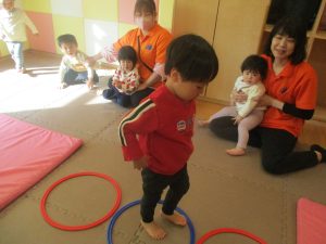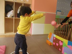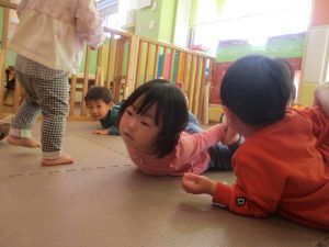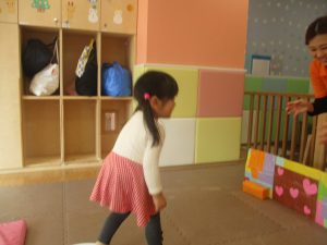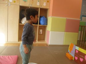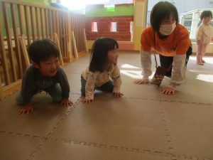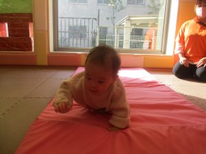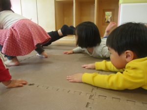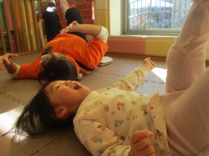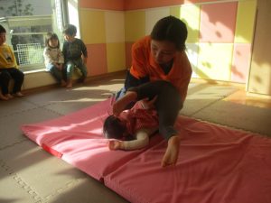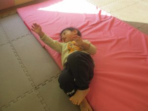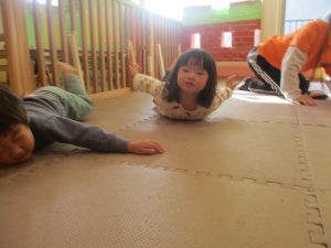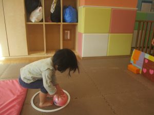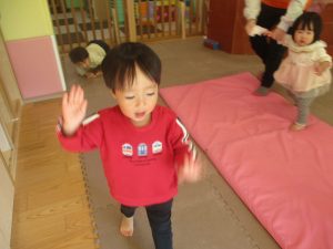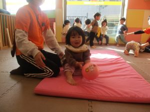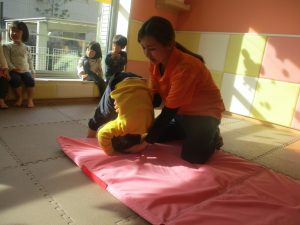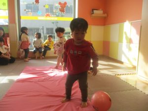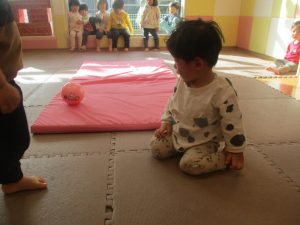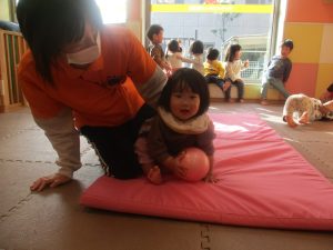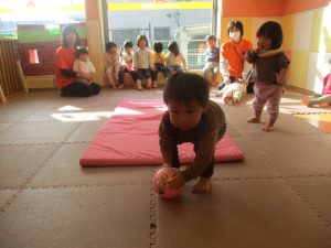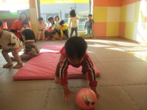 2歳児クラスのお友達は前転をマスター中。小さいクラスのお友達もマットを使って横回転をしみたり、ボールを転がしたり、難しい動きにも頑張って挑戦しておりますよ♪