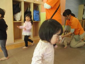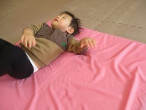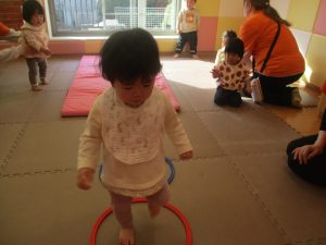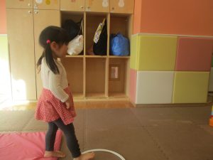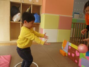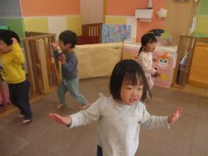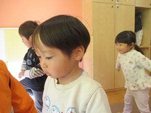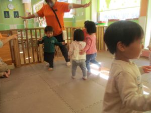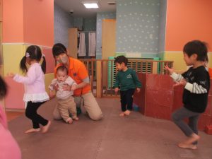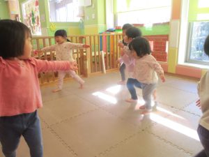 今月のリトミックでは、「たきび」や「あわてんぼうのサンタクロース」の歌に合わて踊ったり、二拍子をしたり、曲のリズムや拍を感じる活動を行っております。