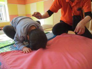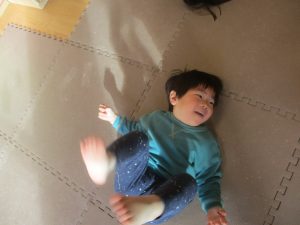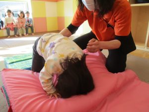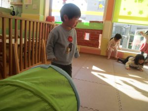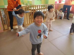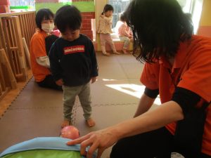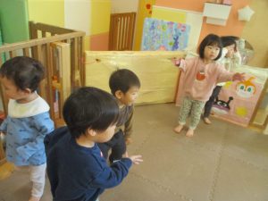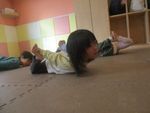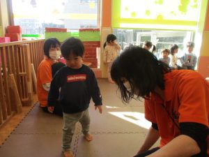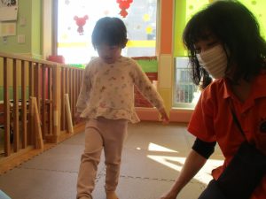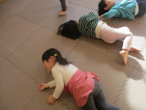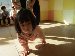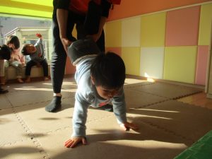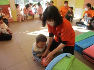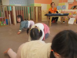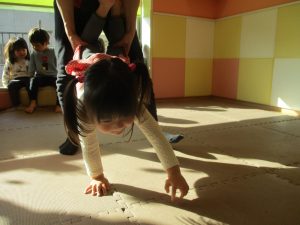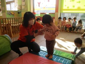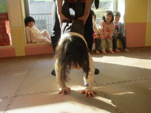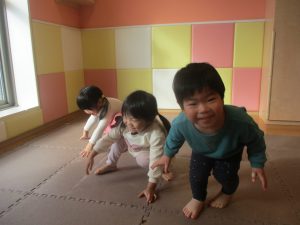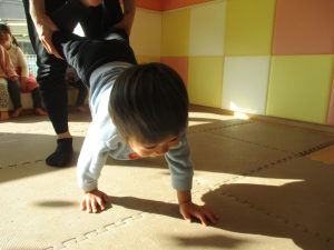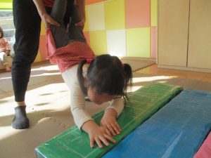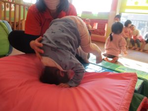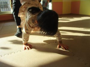 1歳児クラスは、クマ歩きや初めての前転に挑戦。2歳児クラスは”まっすぐ”を意識した前転にも頑張って取り組んでおります☆
