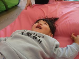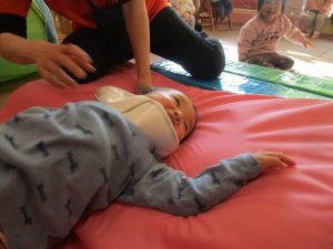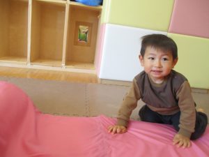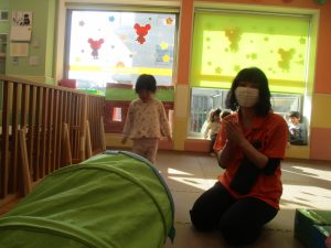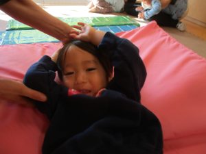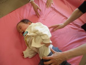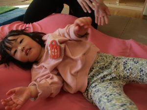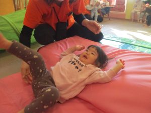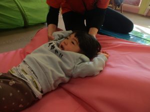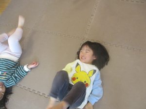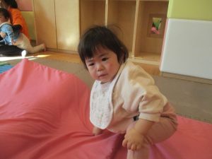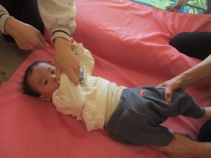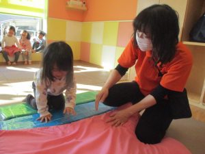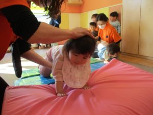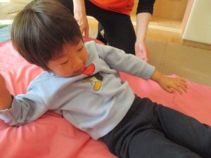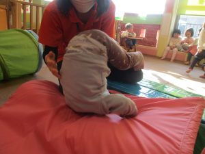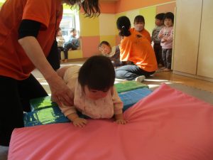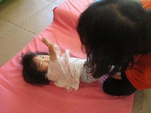 0歳児クラスはマットで横回転を先生と一緒にやってみました☆