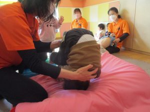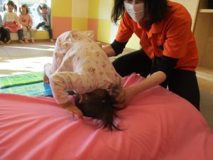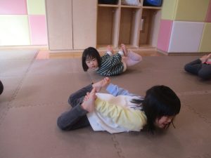 今月の体操ではクラスごとにマット回転にも挑戦。