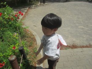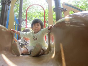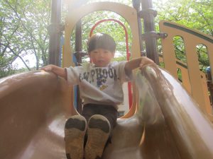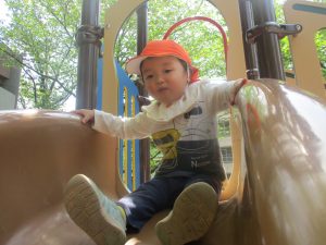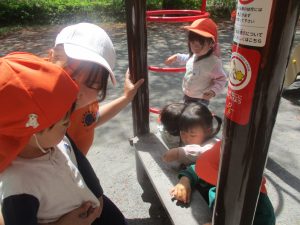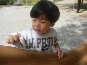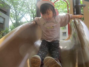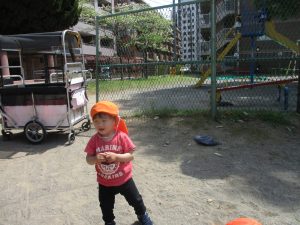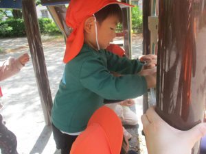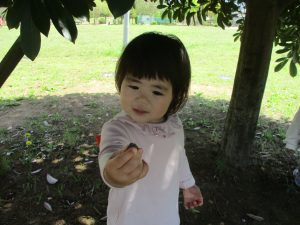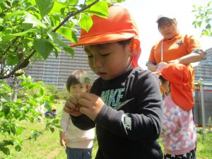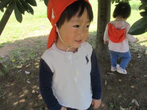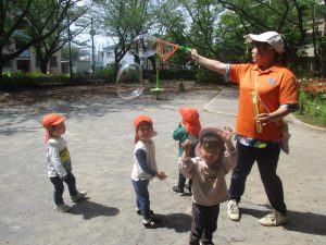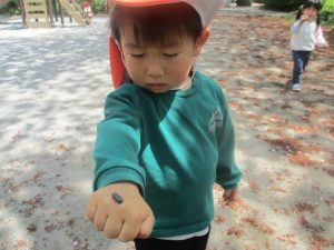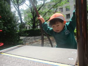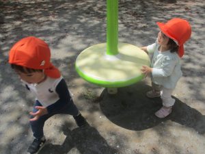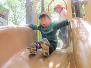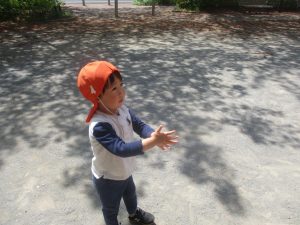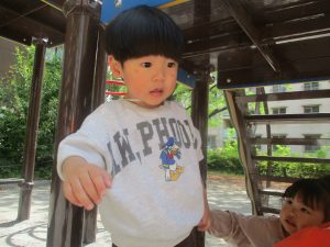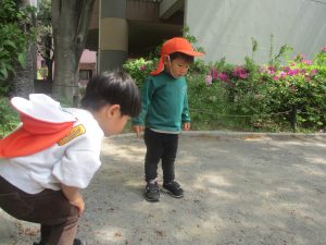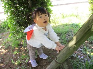 固定遊具を使用したりシャボン玉を追いかけたくさん体を動かしたり、自然物探しに夢中でした。