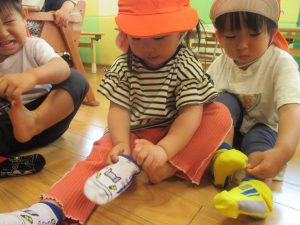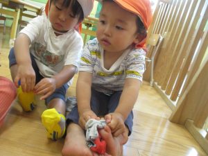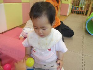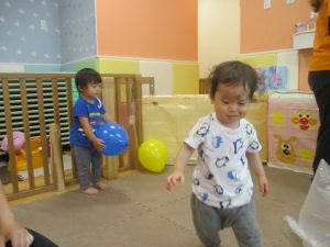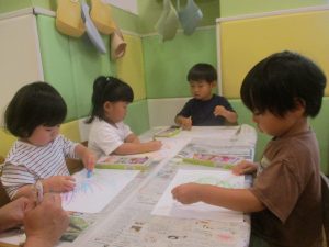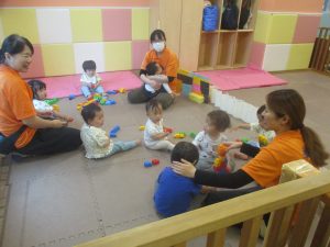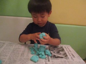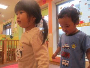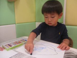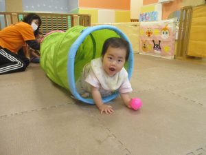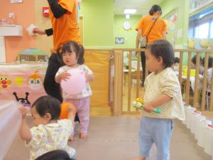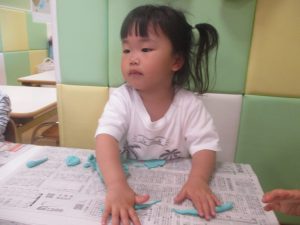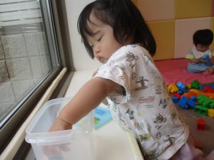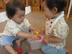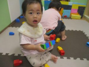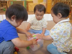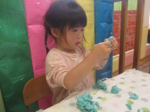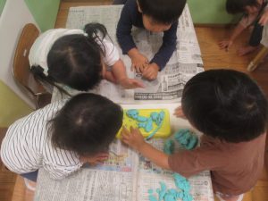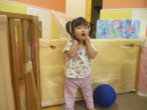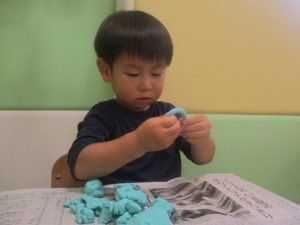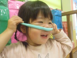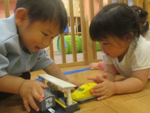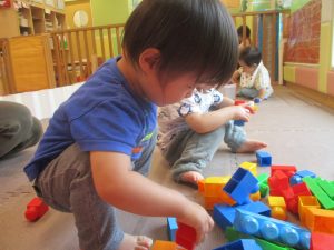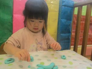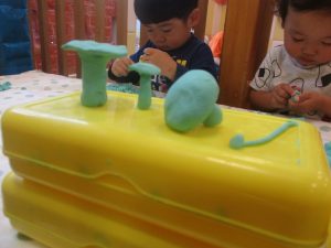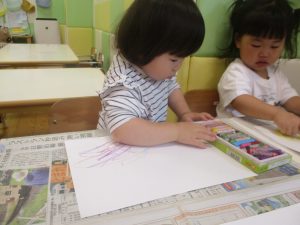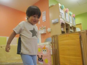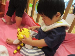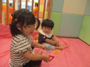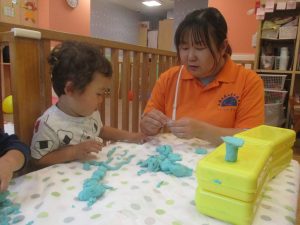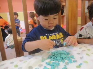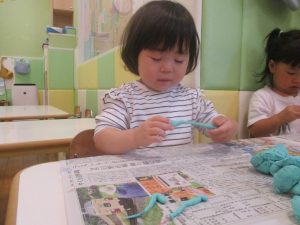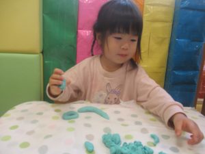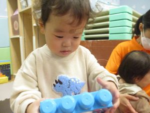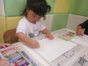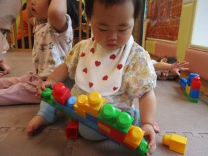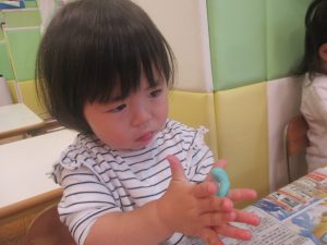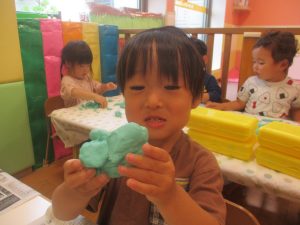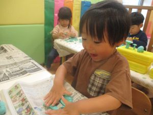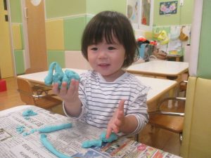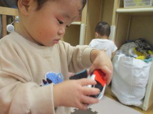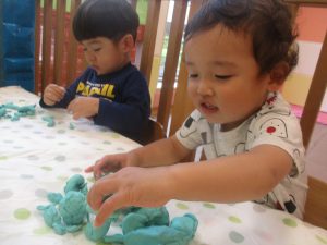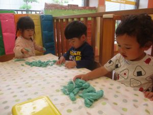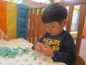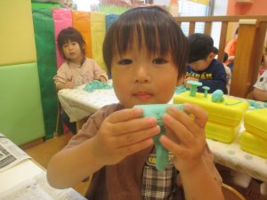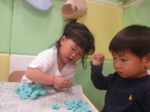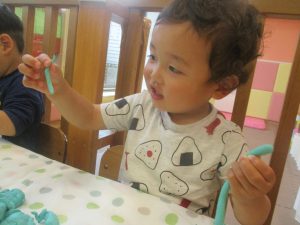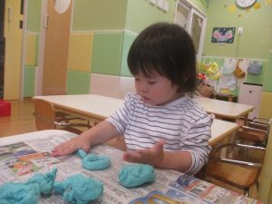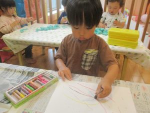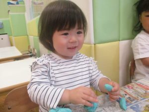 製作・クレヨン・粘土と言った机上遊びを楽しんだり、広い保育室では好きな玩具を見つけては楽しそうに遊んでいました。