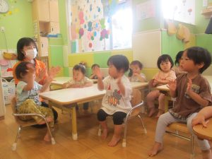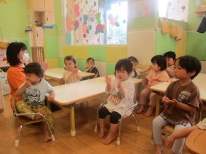 童謡「かたつむり」の歌に合わせて「トンパッ!トンパッ!」と手を閉じて開いて、2拍子のリズムも刻んだり、2文字の色のカードを使いながら「クッロ(トンパッ!)」、「シッロ(トンパッ!)」、「アッカ(トンパッ!)」と2拍子を感覚的に覚えていったりする活動も行っております。