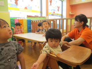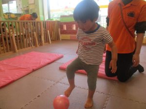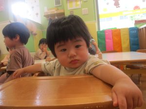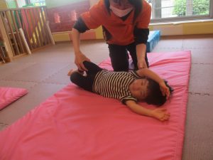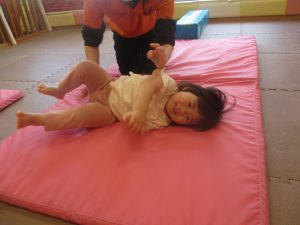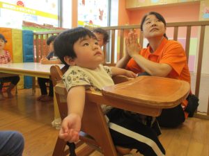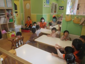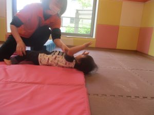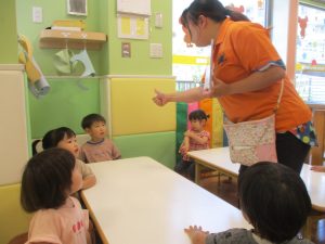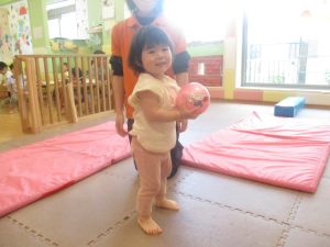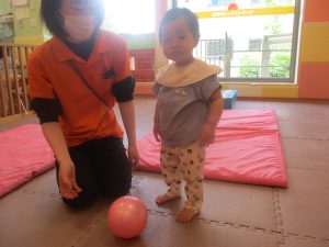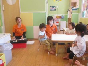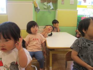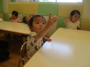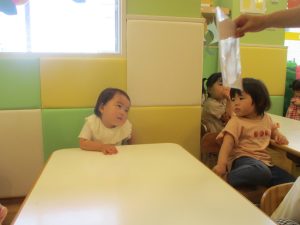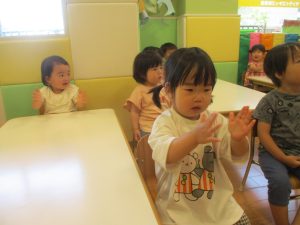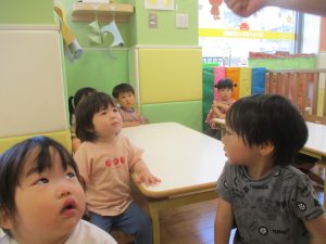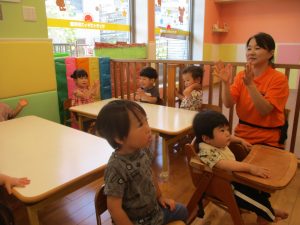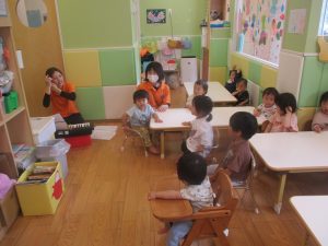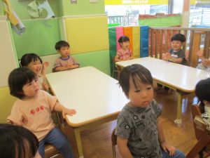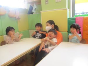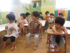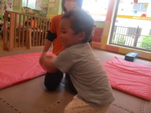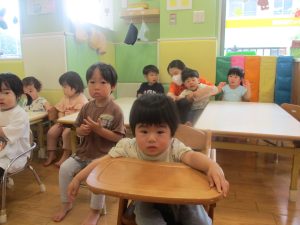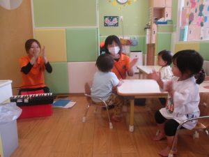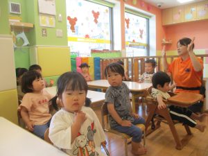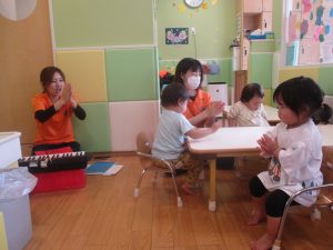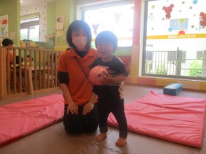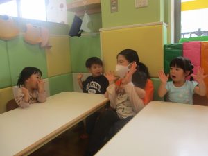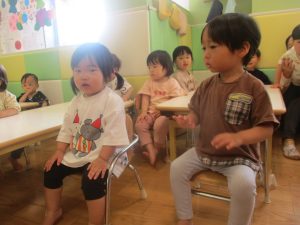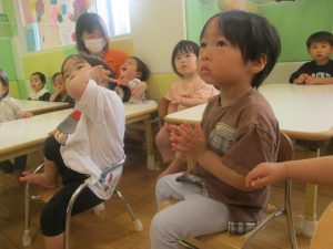 今月のリトミックでは、保育参観でも少し披露させていただいたお名前呼びや音の高低を感じる「高い」「低い」当てクイズを楽しみながら、ハンドサイン「ド」(お膝ポンポン)と「ソ」(肩ポンポン)の音の習得も頑張っております。