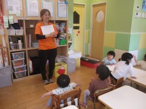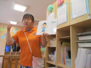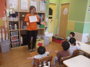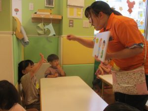 まずは基本となる1~5までの数字を感覚的に習得していきますが、フラッシュカードでは、1~10までの数字を言ってみたり、「How Many Fingers?」と言う曲に合わせて手や足の指を数えたりする活動を行っております。