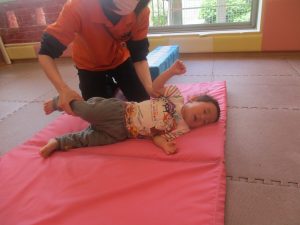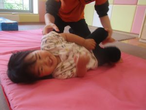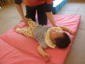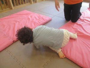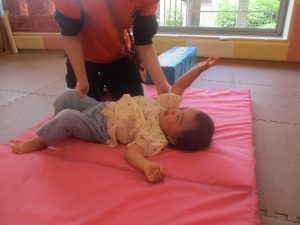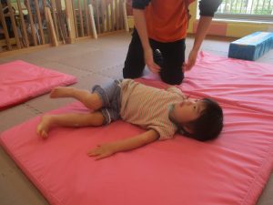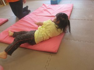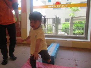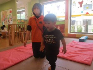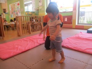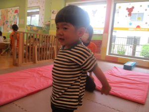 2歳児のお兄さんお姉さんの姿を真似しながら、0、1歳児のお友だちもマットの上を歩いてみたり、転がったりしてマット活動に励んでおります♪