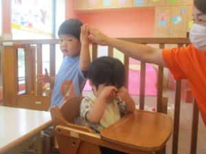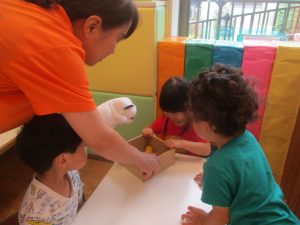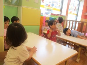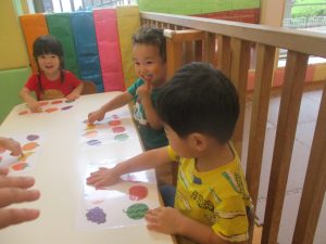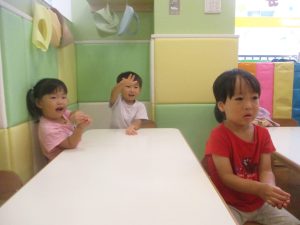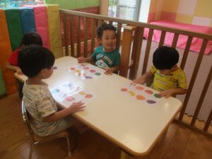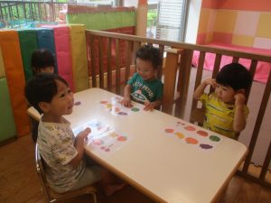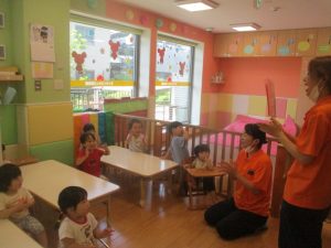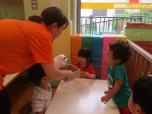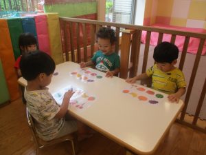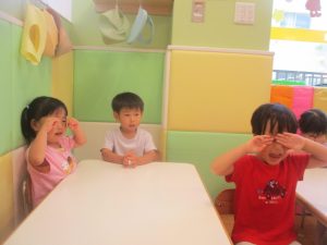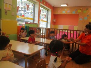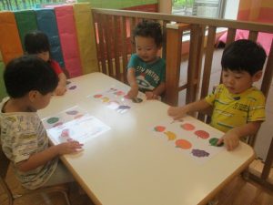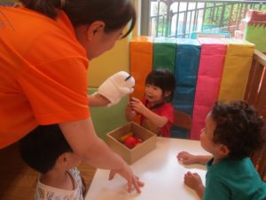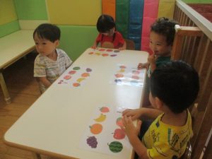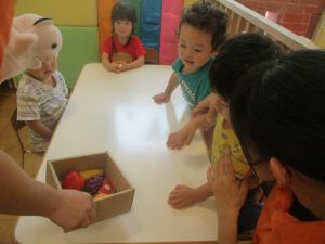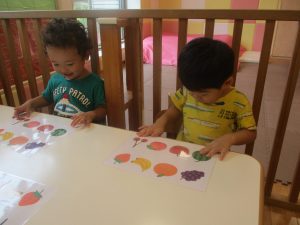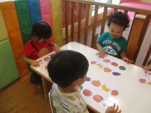 5月に学習した「色」と合わせて振り返り学習も行います。「Are You Hungry?」と言う果物探しのお歌や、箱の中からの果物探しも楽しんでおりますよ♪