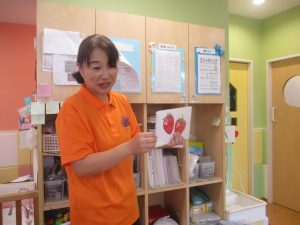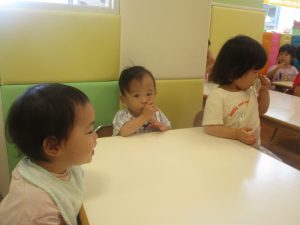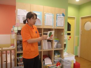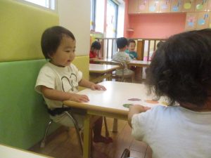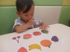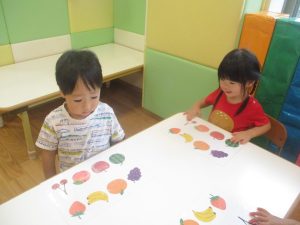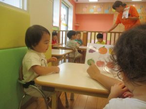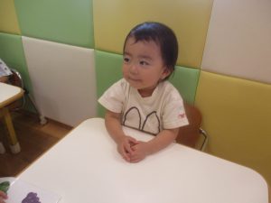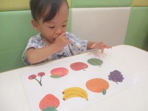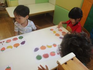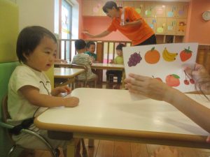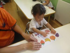 「果物」は7月にフラッシュカードでも行っており、2歳児クラスのお友だちを中心に日本語は既にばっちり!今月は英語にチャレンジです♪